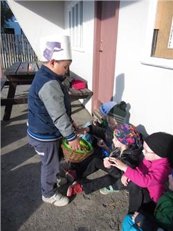 bauð svo öllum í Sólkoti upp á ávexti úr afmæliskörfunni.