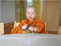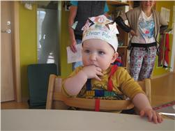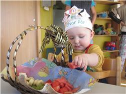 Í ávaxtastundinni sungum við fyrir hann afmælissönginn, hann hefur stækkað í nótt og þetta er afmæliskveðja.