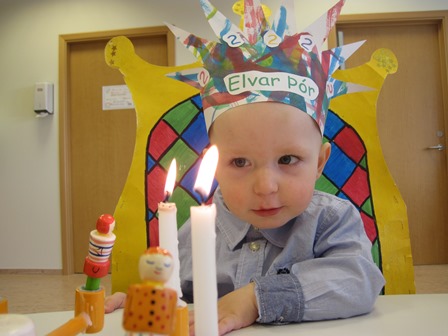 Í ávaxtastundinni sungum við fyrir hann afmælissönginn, hann hefur stækkað í nótt og þetta er afmæliskveðja.