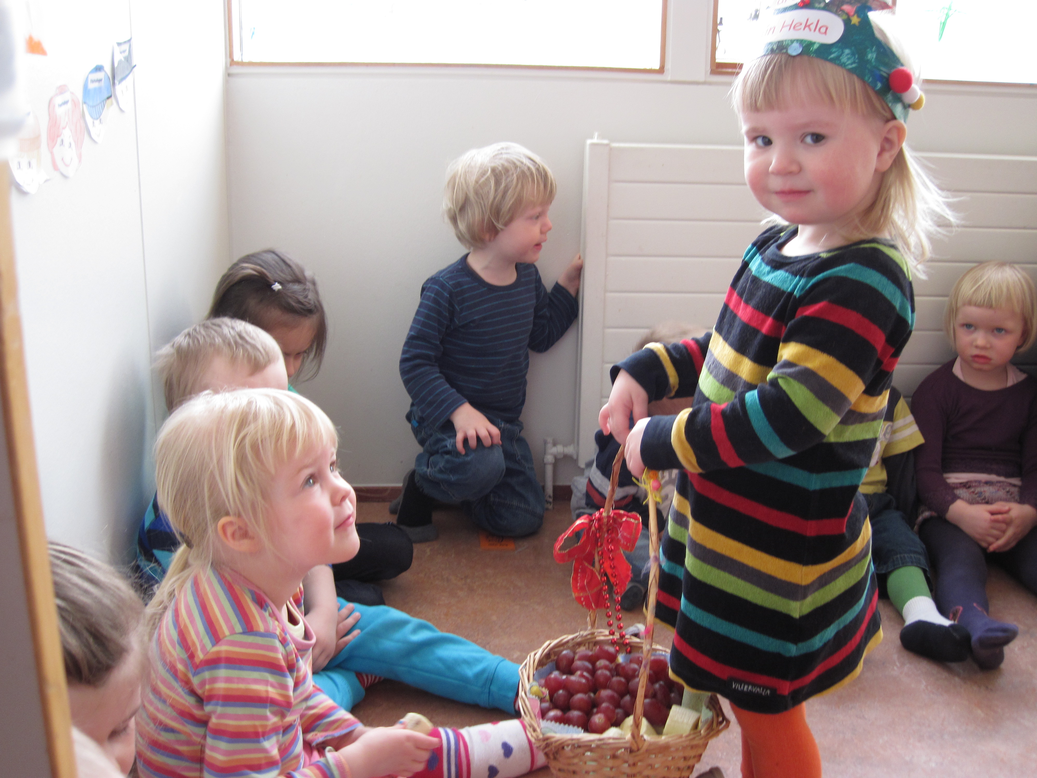 Eftir sönginn bauð Eyrún Hekla öllum á Skakkalandi uppá ávexti úr ávaxtakörfunni.