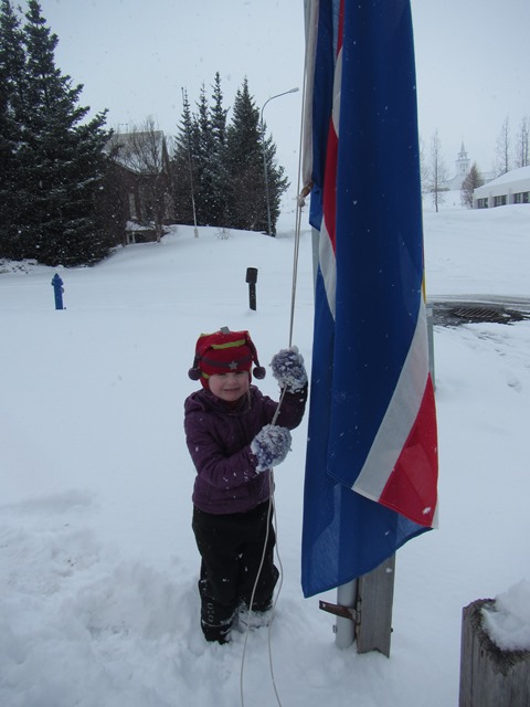 Einnig fór hún út og flaggaði íslenska fánanum í tilefni dagsins.