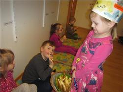 og bauð svo öllum í Mánakoti upp á ávexti úr afmæliskörfunni.