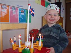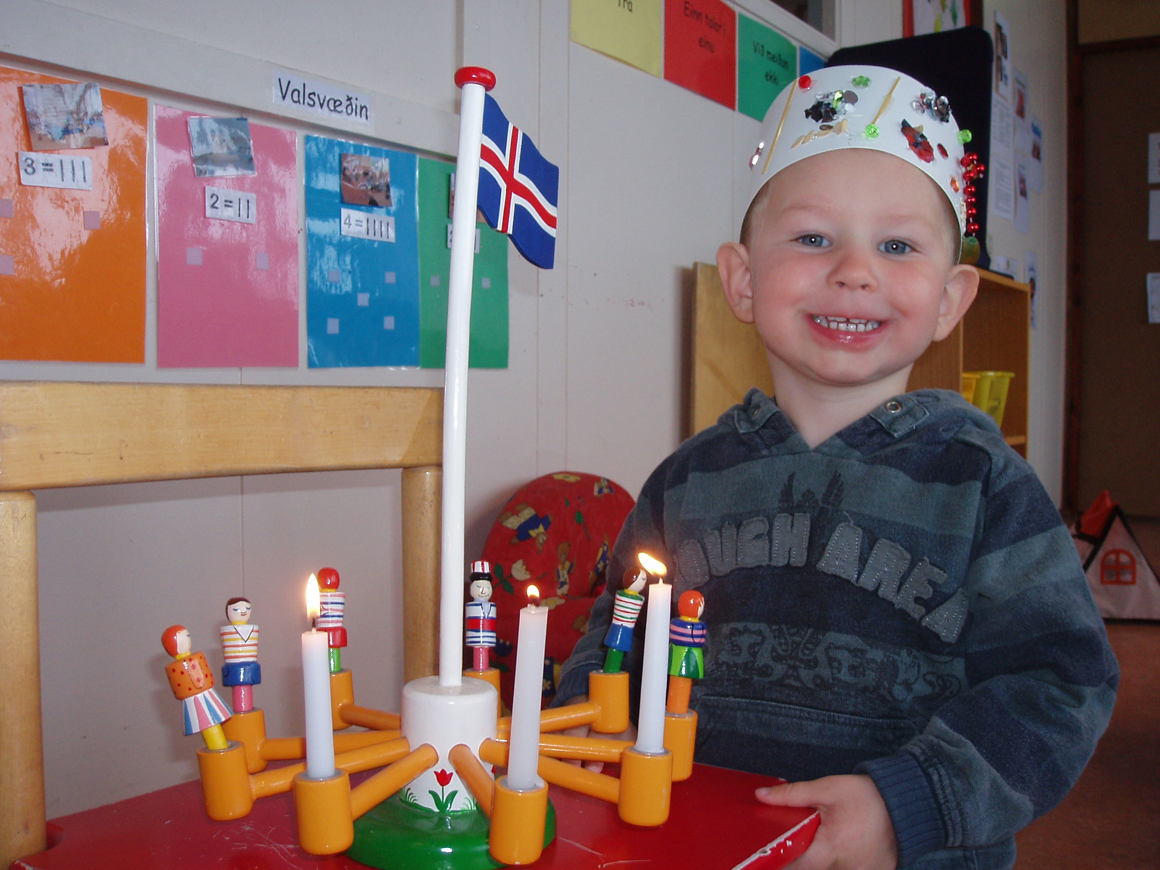 í dag héldum við upp á 3. ára afmælið hans Fannars Inga. Það fyrsta sem hann gerði var að setja upp kórónuna sem hann var búin að búa sér til. Síðan fór hann út og flaggaði og bauð öllum upp á ávexti. Á söngfundi og í ávaxtastundinni sungu allir afmælissönginn fyrir hann í tilefni dagsins. Einnig var hann þjónn dagsins. Við óskum honum til hamingju með daginn frá öllum á Skakkalandi.