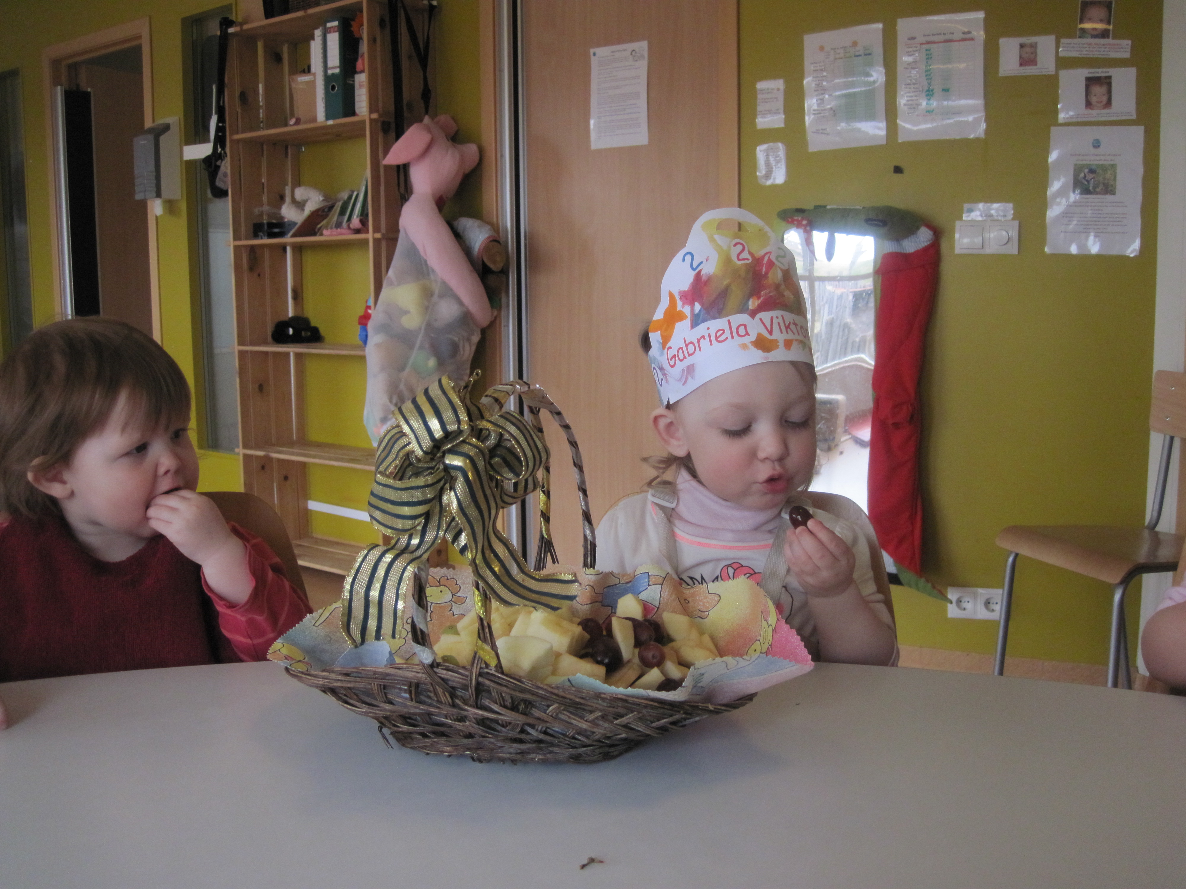 Í ávaxtastundinni sungum við fyrir hana afmælissönginn, hún hefur stækkað í nótt og þetta er afmæliskveðja.
