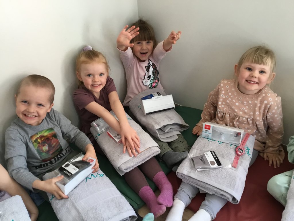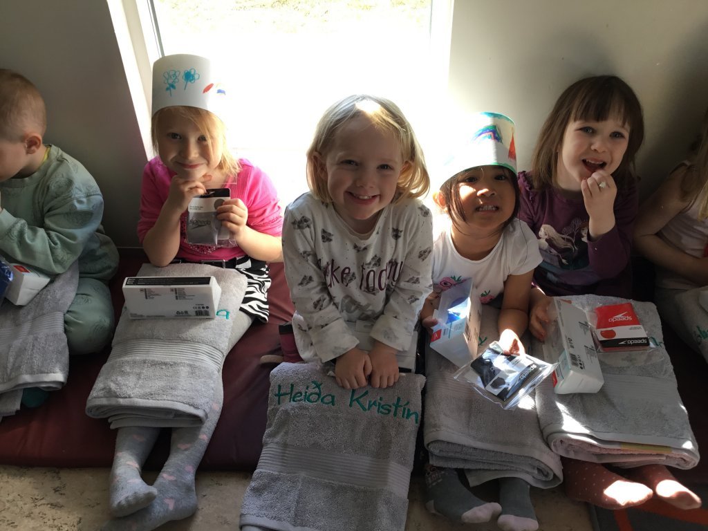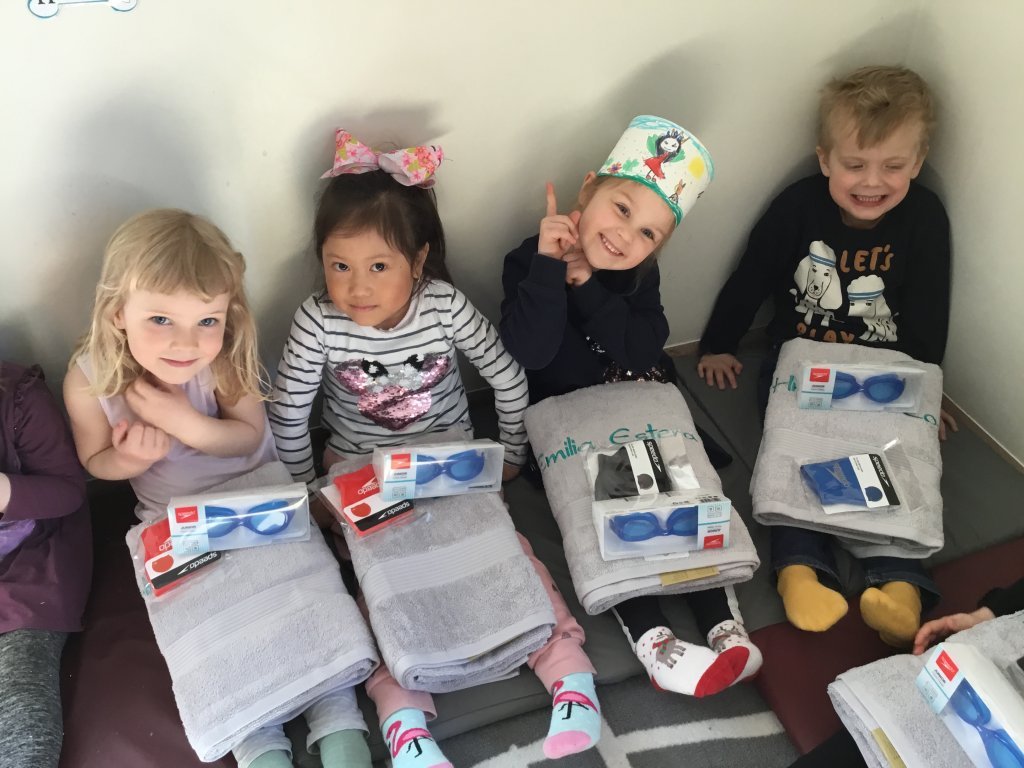 Núna í lok apríl afhentu svo foreldrafélagið nemendum á Kátakoti handklæði, sundhettu og sundgleraugu sem þau munu svo nota þegar þau byrja í sundi í haust á Hólakoti.