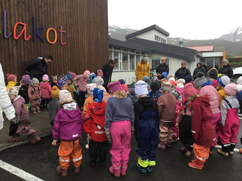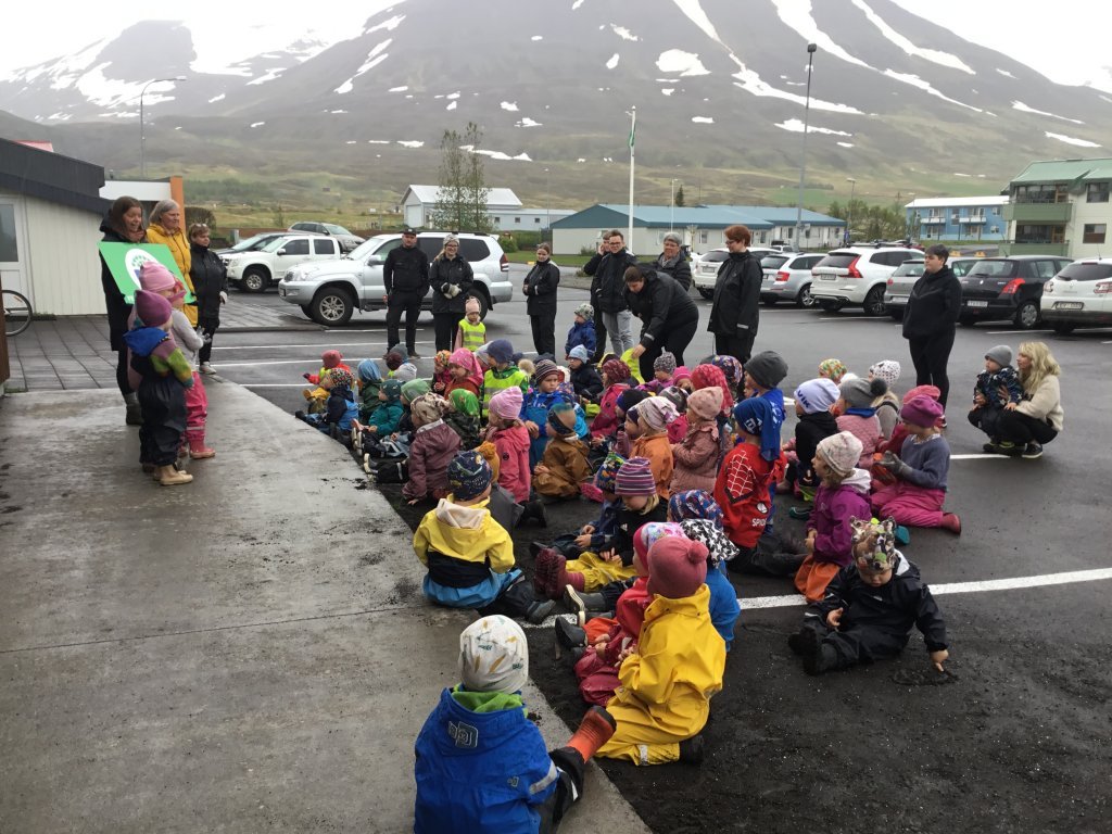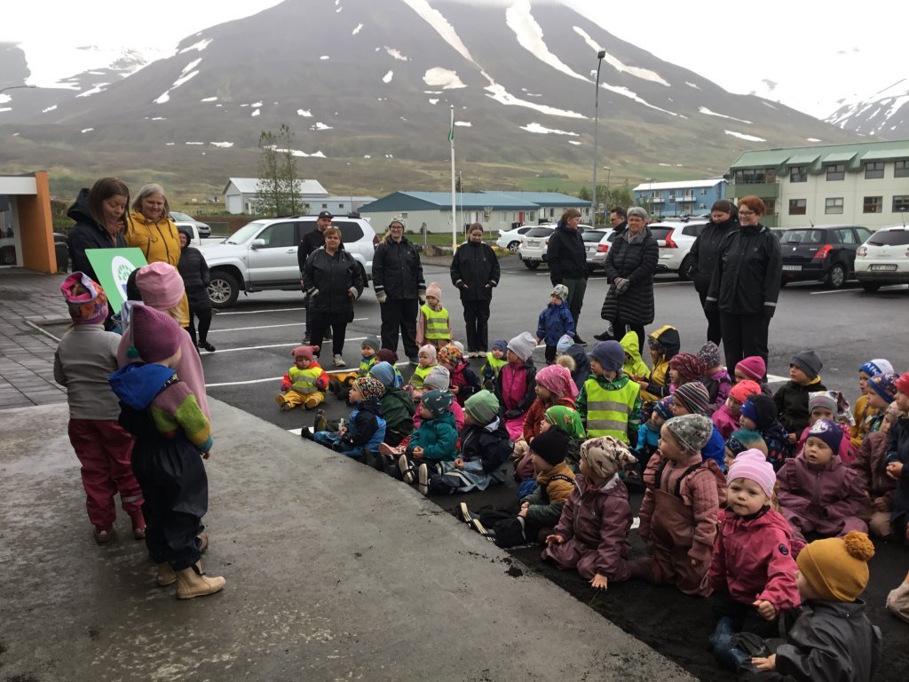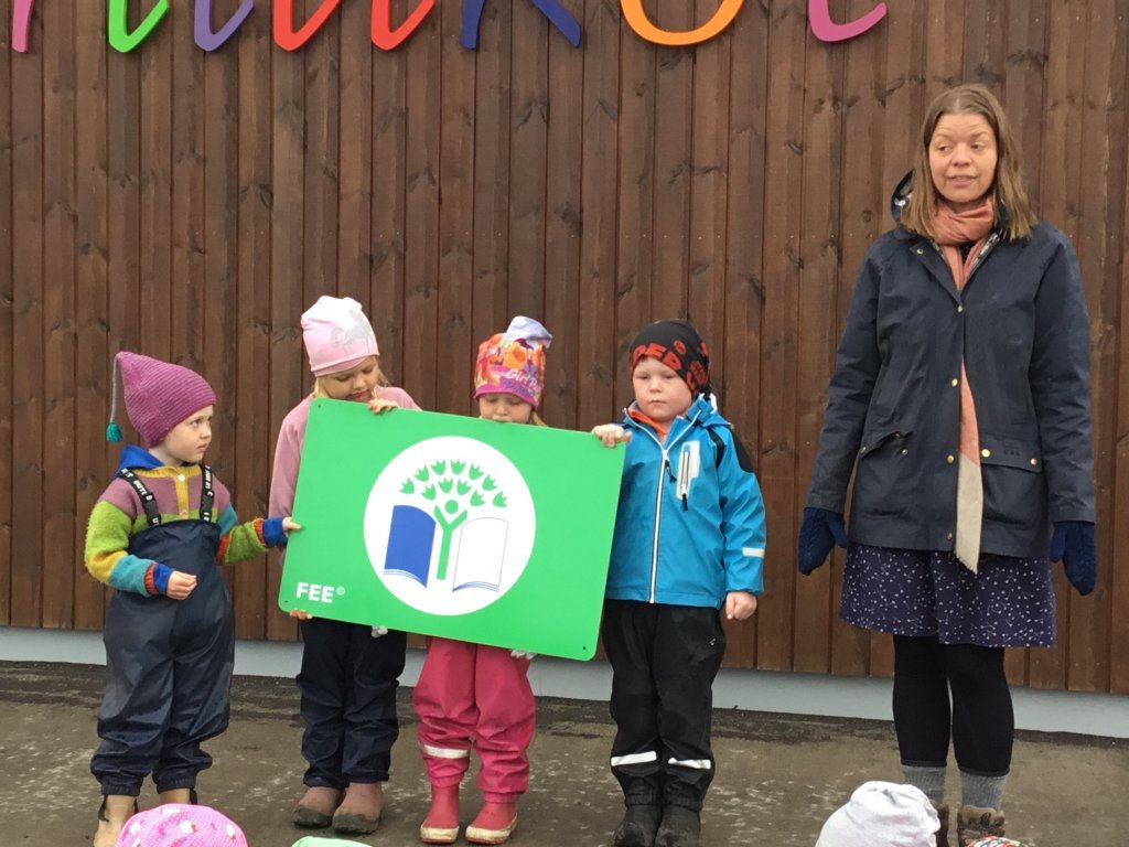 Í dag flögguðum við nýjum Grænfána en það er í fimmta skipti sem honum er flaggað. Áttum saman hátíðlega stund úti á bílaplani leikskólans. Sett var upp skilti með merki Grænfánans og Katrín frá landvernd ræddi við börnin um mikilvægi þess að ganga vel um jörðina.
