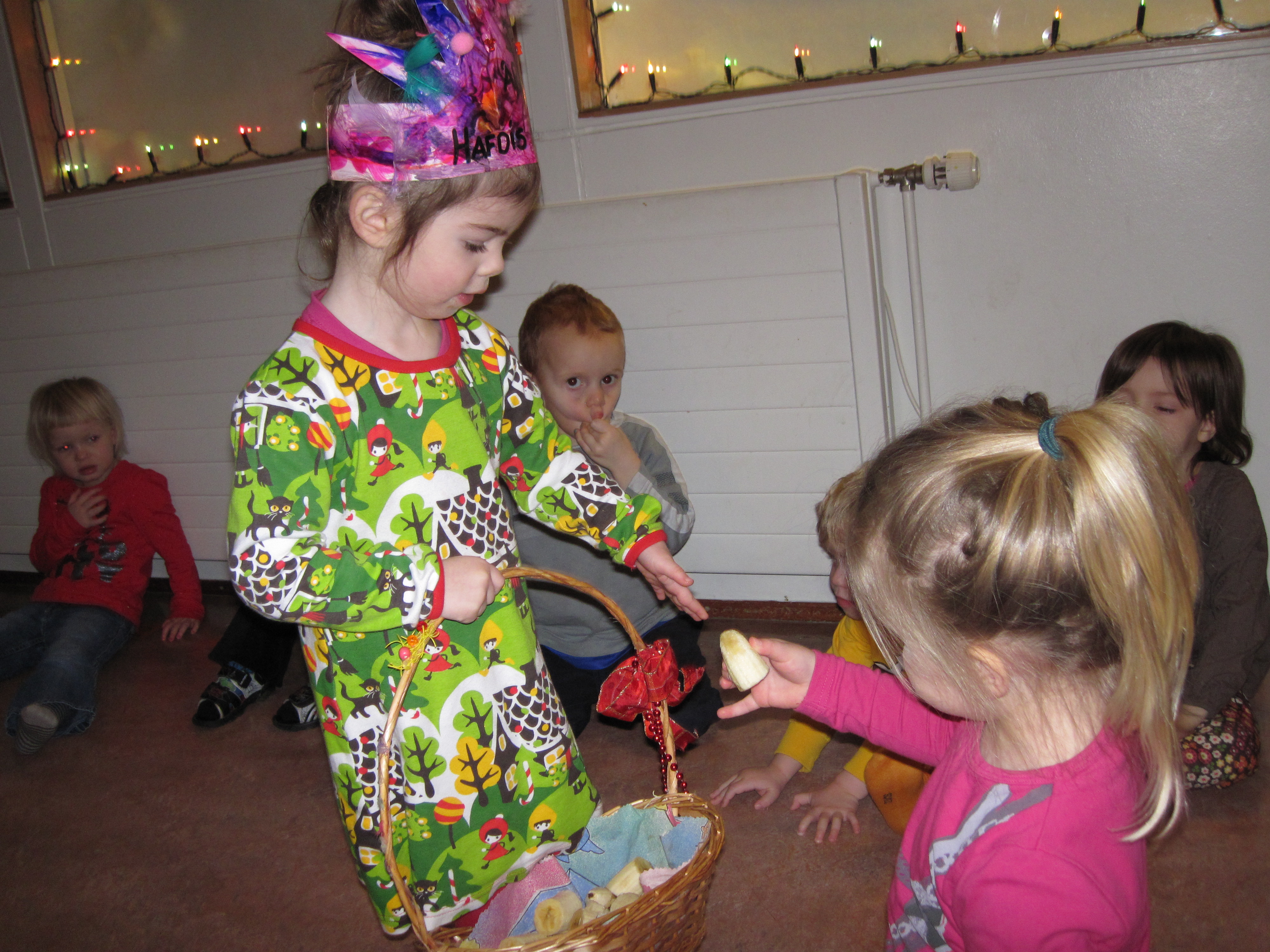Eftir sönginn bauð Hafdís Nína öllum á Skakkalandi uppá ávexti úr ávaxtakörfunni.