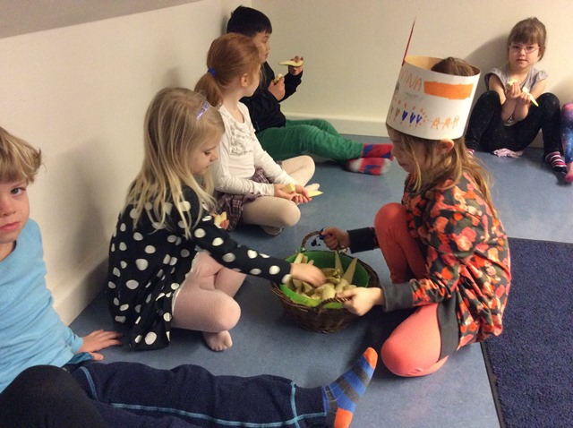 bauð svo öllum í Sólkoti upp á ávexti úr afmæliskörfunni.