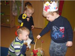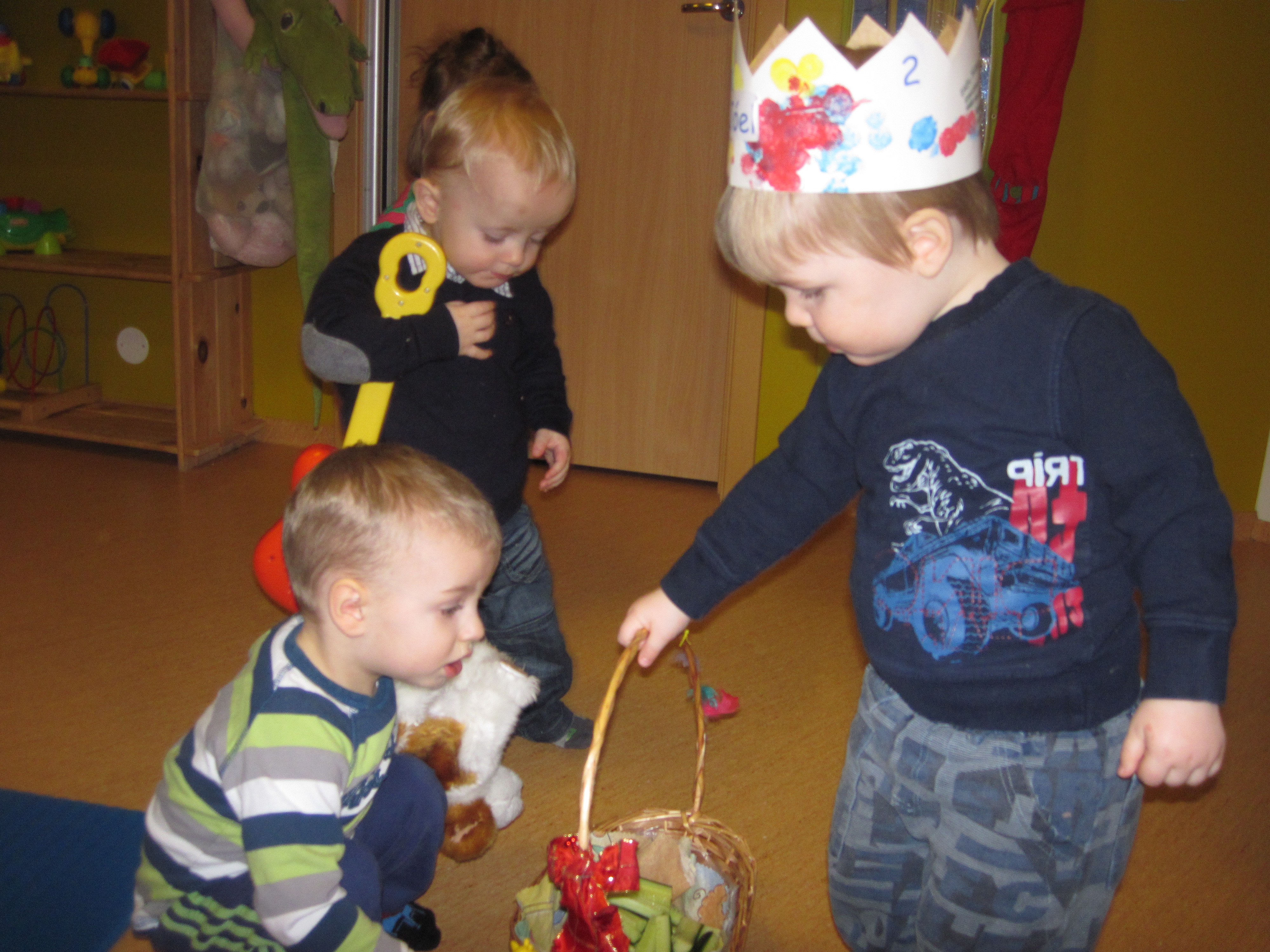 Hann var búin að búa sér til kórónu og setti hana upp í tilefni dagsins. Í ávaxtastundinni og á söngfundi sungum við fyrir hann afmælissönginn, hann hefur stækkað í nótt og þetta er afmæliskveðja. Síðan bauð hann öllum á Skýjaborg upp á grænmeti og magál úr afmæliskörfunni. Flögguðum fyrir hann í tilefni dagsins.
