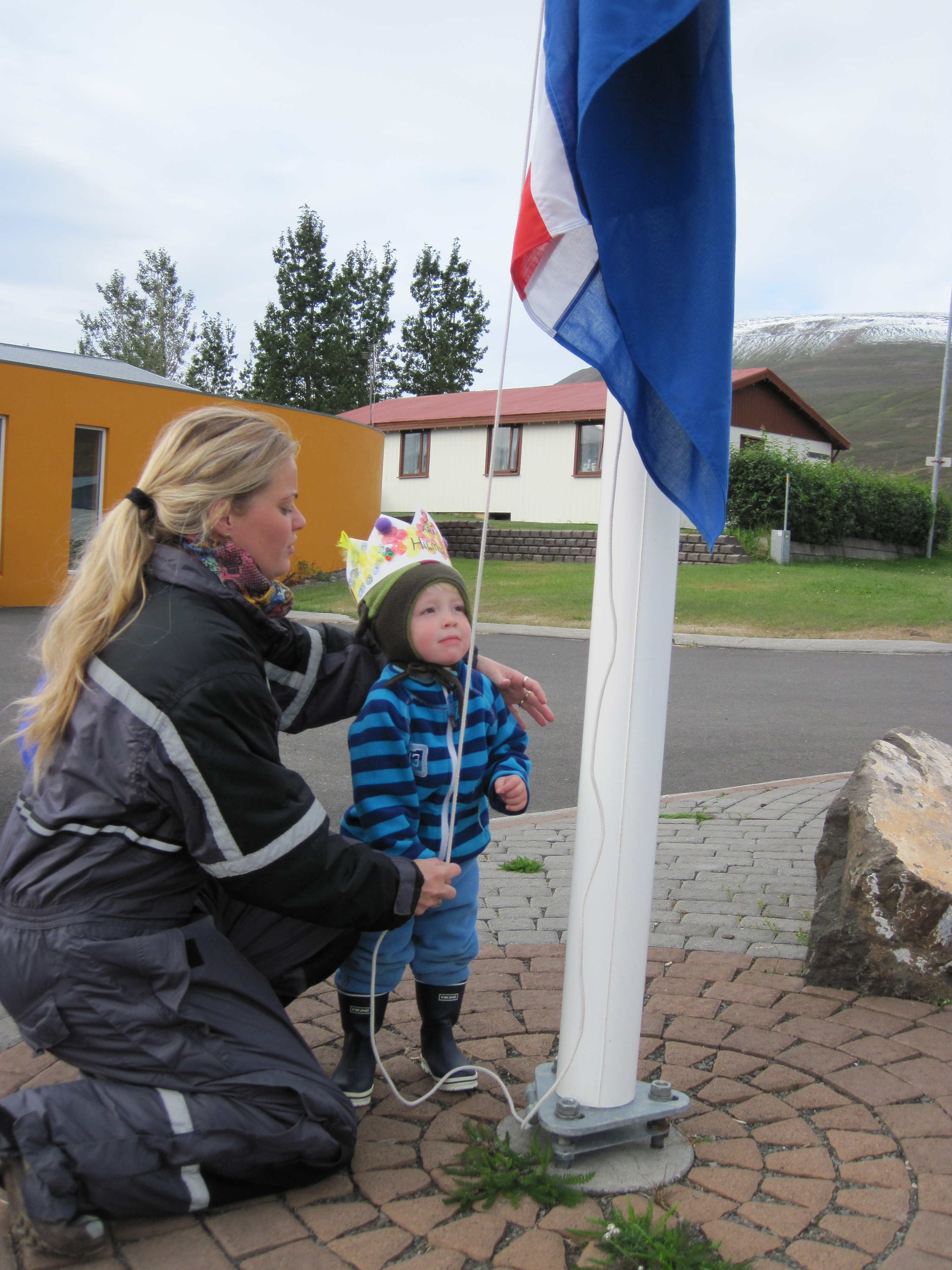 Hilmir Þór málaði sér kórónu og flaggaði íslenska fánanum.