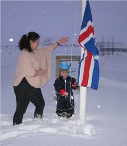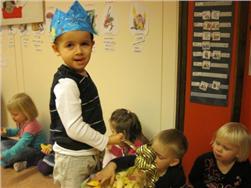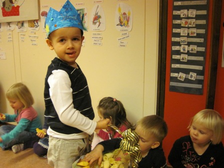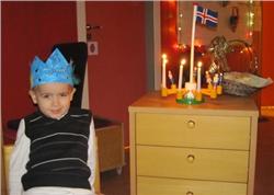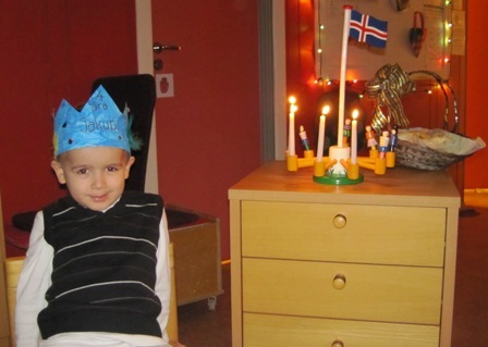 Jakub málaði sér kórónu og flaggaði íslenska fánanum. Í ávaxtastundinni sungum við fyrir hann afmælissönginn og hann blés á kertin fjögur.