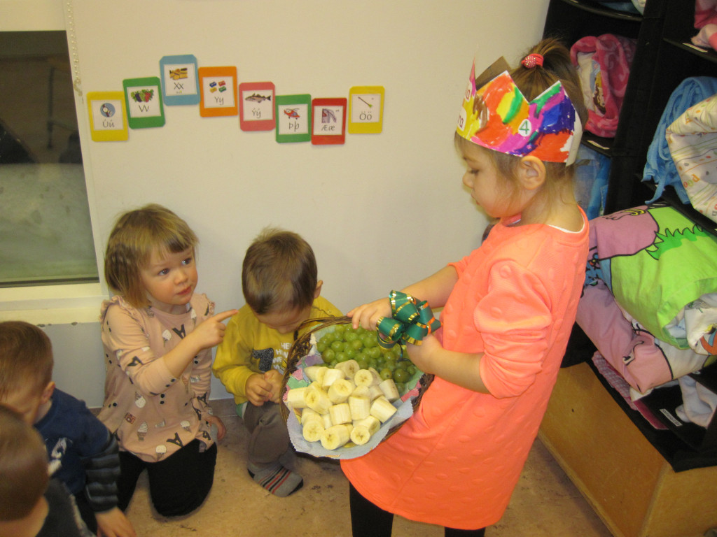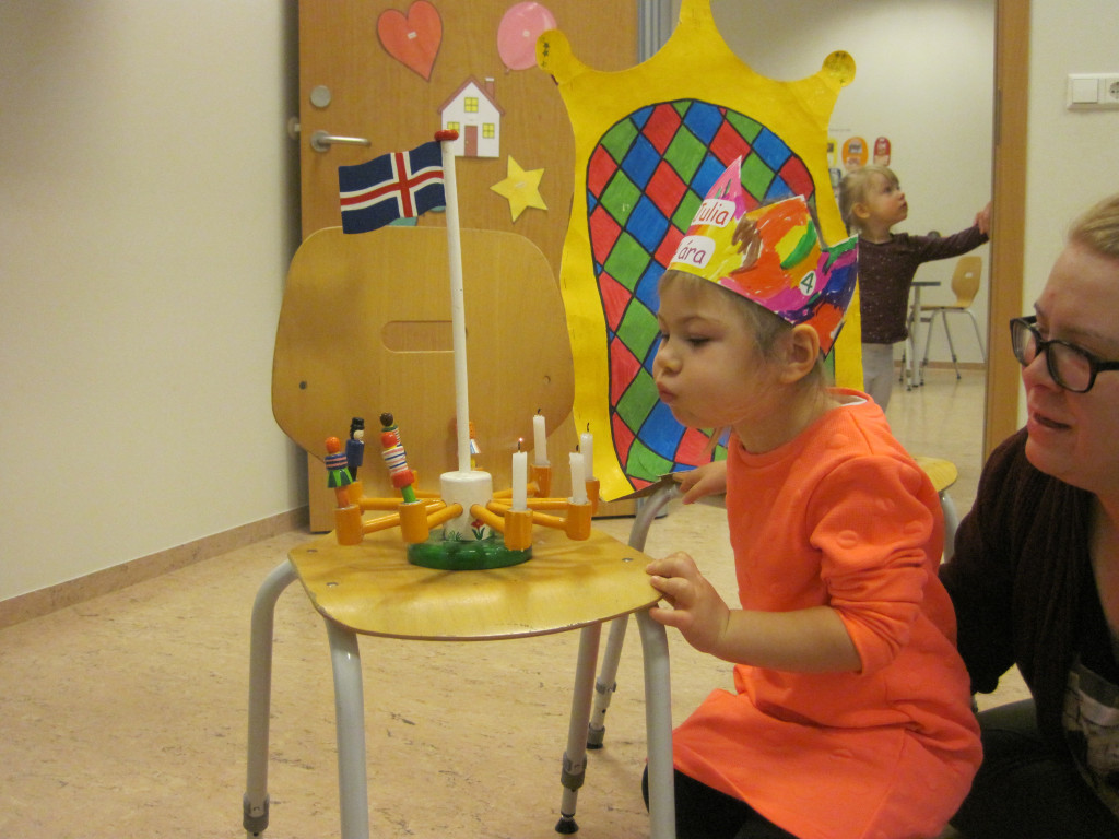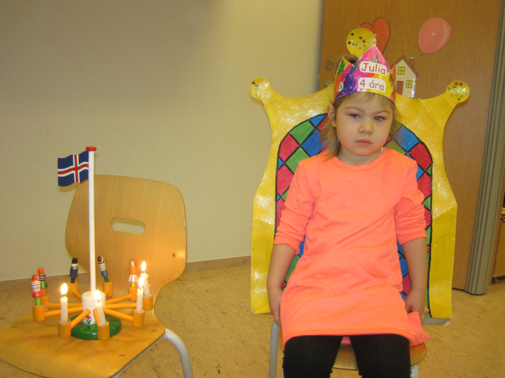 Í dag héldum við upp á 4 ára afmælið hennar Juliu. Julia málaði á flottu kórónuna sína og flaggði íslenska fánanum í tilefni dagsins. Í ávaxtastundinni sungum við fyrir hana afmælissönginn, hún hefur stækkað í nótt og þetta er afmæliskveðja. Eftir sönginn fengu sér allir ávexti úr ávaxtakörfunni.