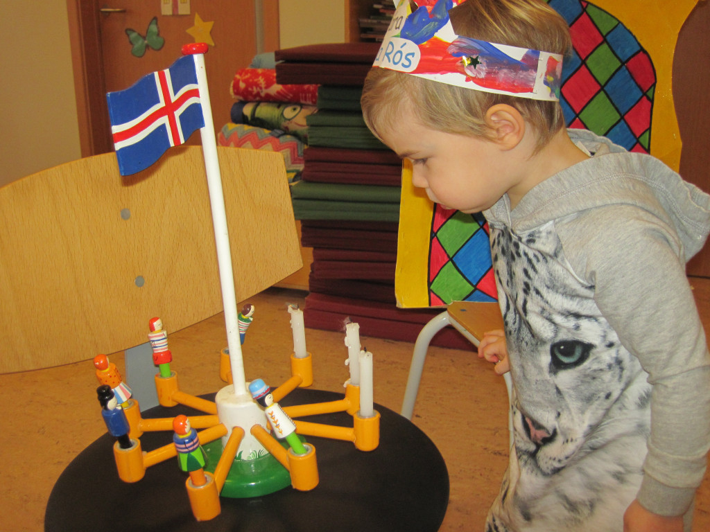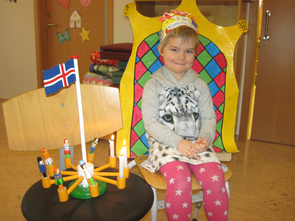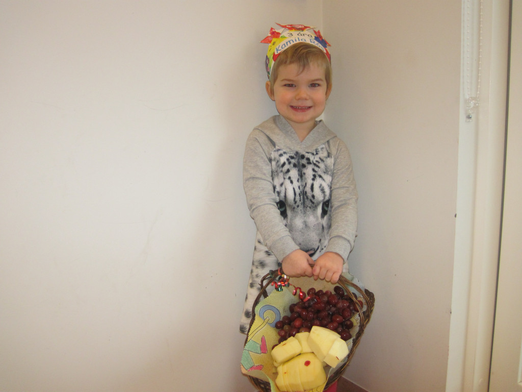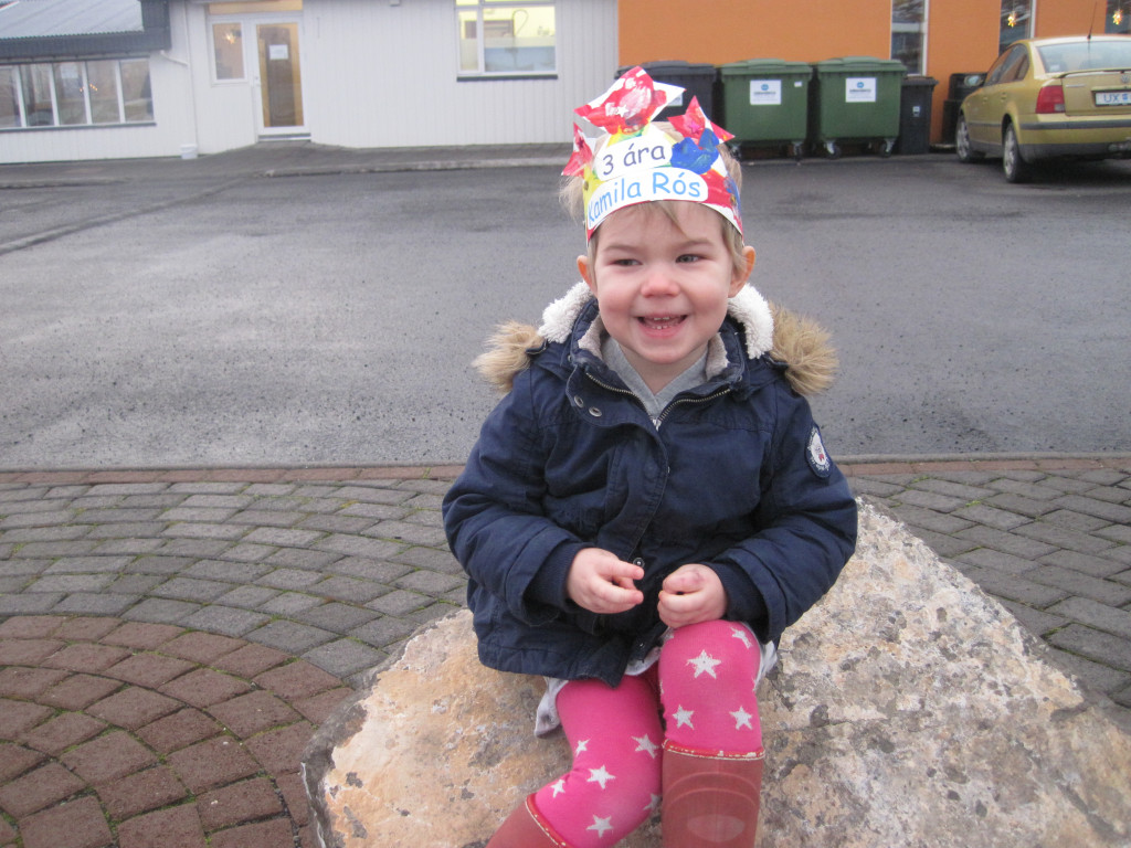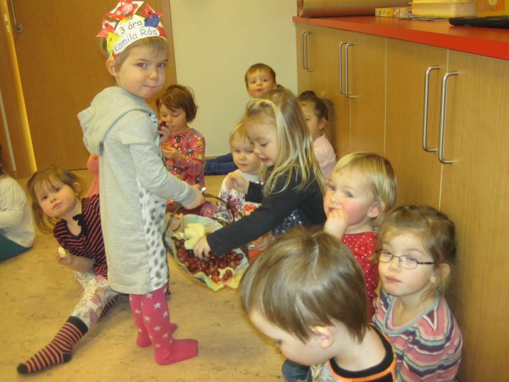 Í dag héldum við upp á 3 ára afmælið hennar Kamilu Rósar. Kamila Rós málaði á flottu kórónuna sína og flaggði íslenska fánanum í tilefni dagsins. Í ávaxtastundinni sungum við fyrir hana afmælissönginn, hún hefur stækkað í nótt og þetta er afmæliskveðja. Eftir sönginn fengu sér allir ávexti úr ávaxtakörfunni.
