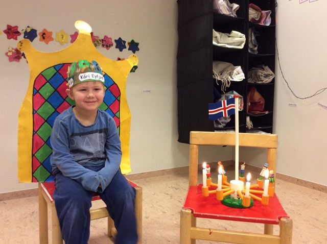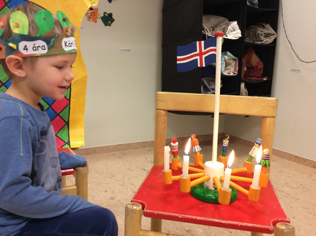 Á morgun 3. október verður hann Kári Eyfjörð 4 ára og héldum við upp á daginn hans hér í Krílakoti í dag. Kári Eyfjörð bjó sér til glæsilega kórónu, bauð upp á ávexti úr afmæliskörfunni, flaggaði íslenska fánanum og svo sungum við fyrir hann afmælissönginn Við óskum Kára Eyfjörð og fjölskyldu hans innilega til hamingju með daginn frá öllum í Krílakoti