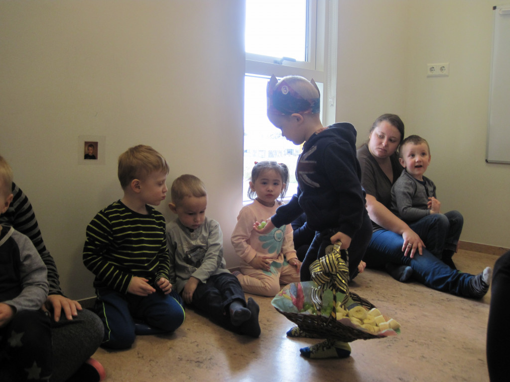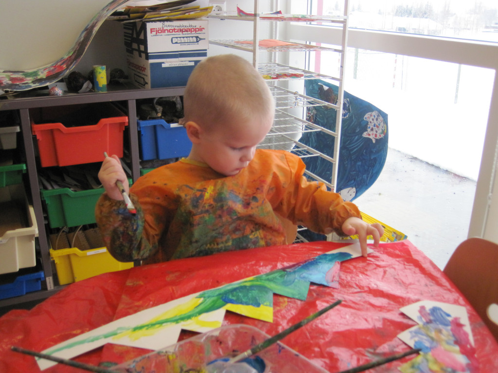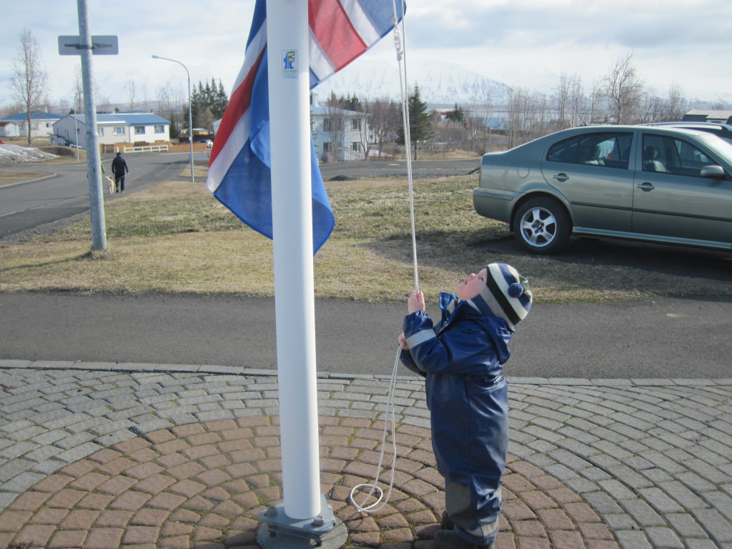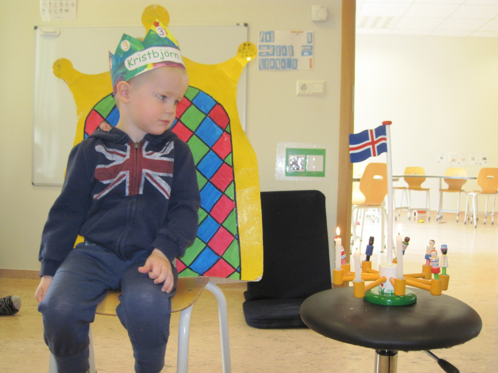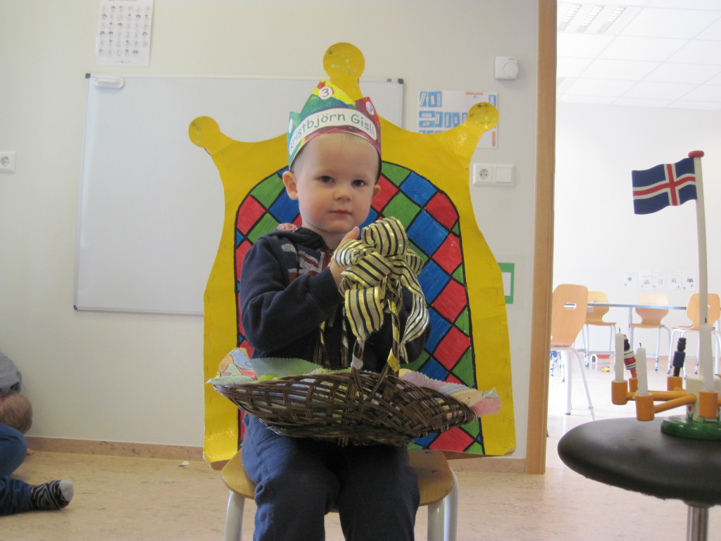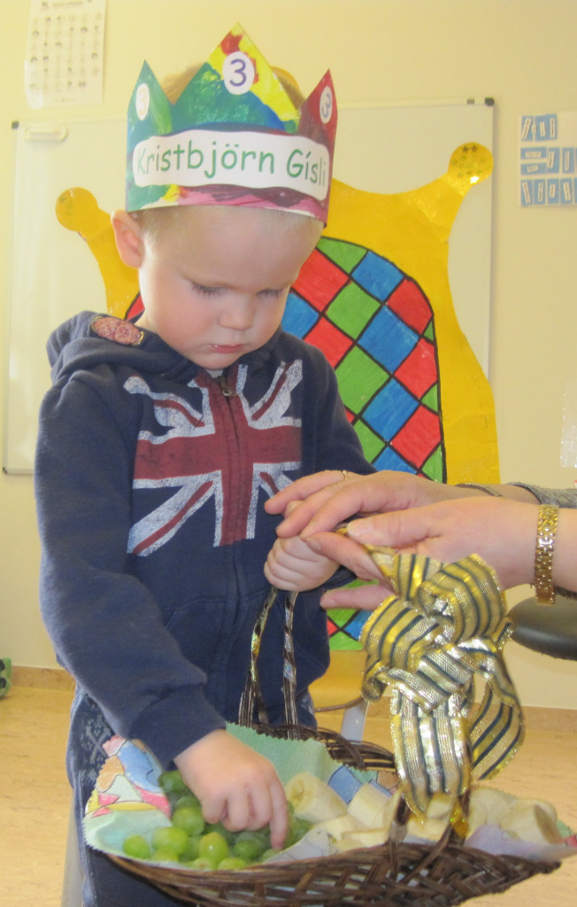 Í dag héldum við upp á 3 ára afmælið hans Kristbjörns Gísla. Hann bjó sér til fallega kórónu og flaggði íslenska fánanum í tilefni dagsins. Í ávaxtastundinni bauð hann upp á ávexti úr ávaxtakörfunni og við sungum fyrir hann afmælissönginn, hann hefur stækkað í nótt og þetta er afmæliskveðja.