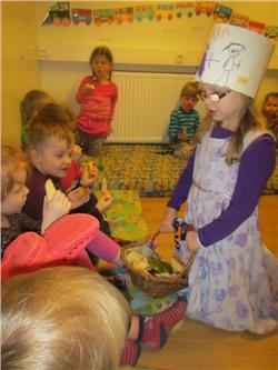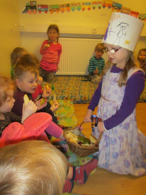 bauð svo öllum í Mánakoti upp á ávexti úr afmæliskörfunni.