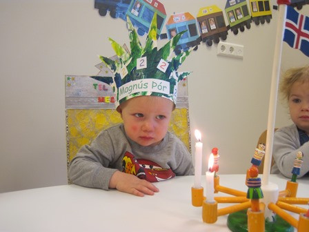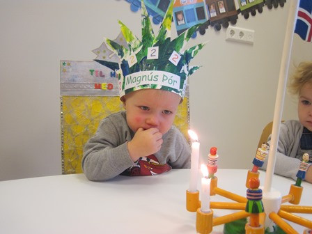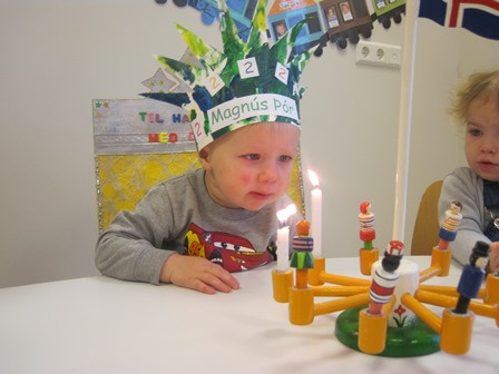 Í dag héldum við upp á 2 ára afmælið hans Magnúsar Þórs en hann á afmæli á sunndaginn 23 október. Magnús Þór málaði á flottu kórónuna sína og flaggði íslenska fánanum í tilefni dagsins. Í ávaxtastundinni sungum við fyrir hann afmælissönginn, hann hefur stækkað í nótt og þetta er afmæliskveðja. Eftir sönginn fengu sér allir ávexti úr ávaxtakörfunni. Við óskum Magnúsi Þór og fjölskyldu hans til hamingju með daginn.