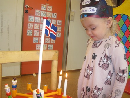 Í ávaxtastundinni sungum við fyrir hana afmælissönginn, hún hefur stækkað í nótt og þetta er afmæliskveðja.