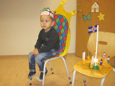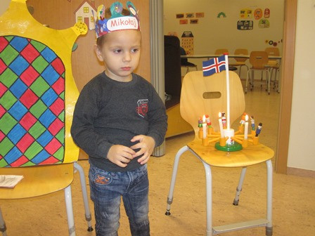 Í dag héldum við upp á 3 ára afmælið hans Mikołaj en hann á afmæli á laugardaginn 10. desember. Mikołaj málaði á flottu kórónuna sína og flaggði íslenska fánanum í tilefni dagsins. Í ávaxtastundinni sungum við fyrir hann afmælissönginn, hann hefur stækkað í nótt og þetta er afmæliskveðja. Eftir sönginn fengu sér allir ávexti úr ávaxtakörfunni.