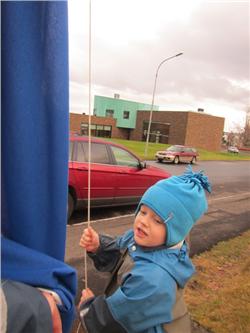 hann blés á afmæliskertin 4. Að lokum flaggaði hann íslenska fánanum í tilefni dagsins.