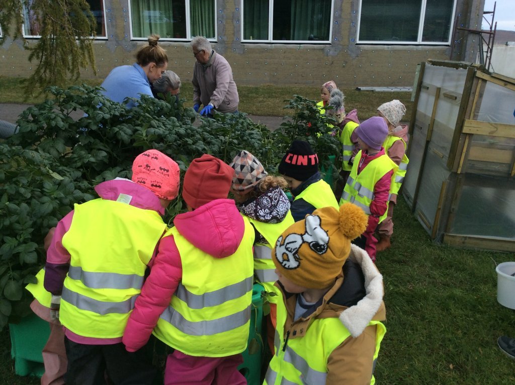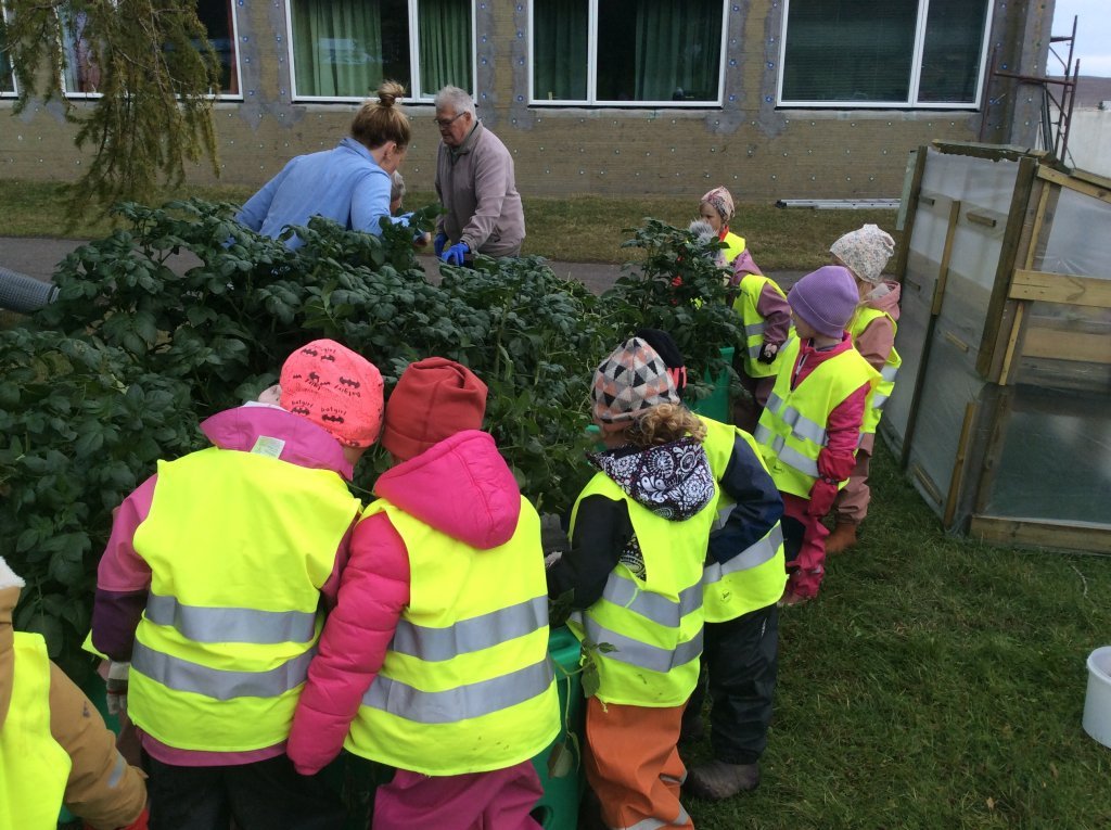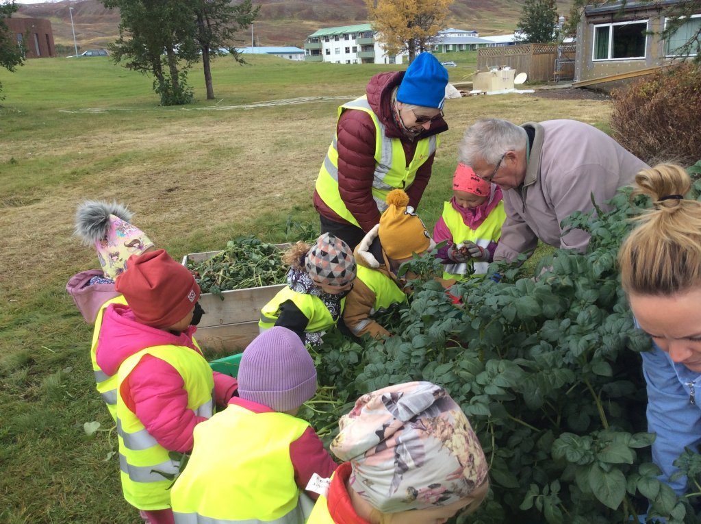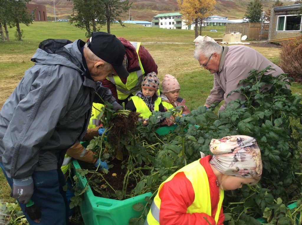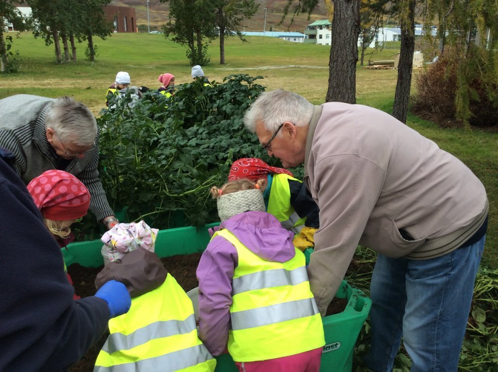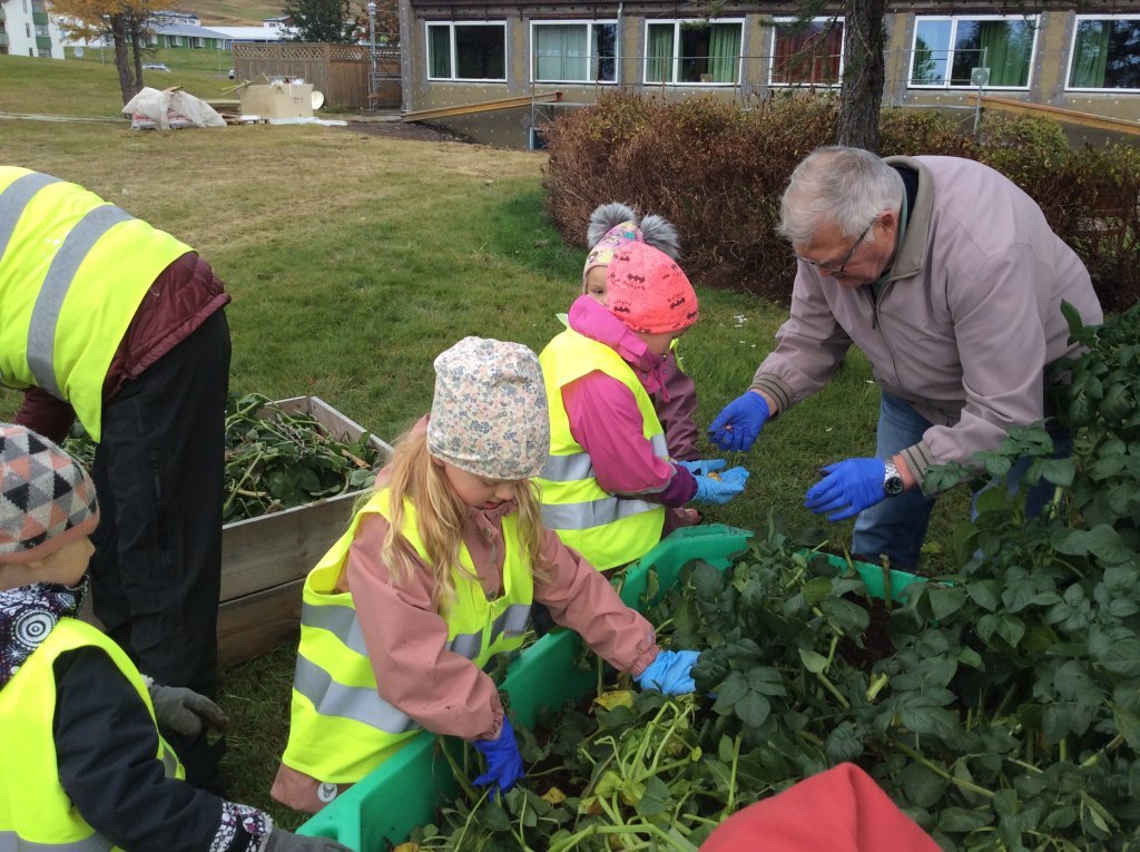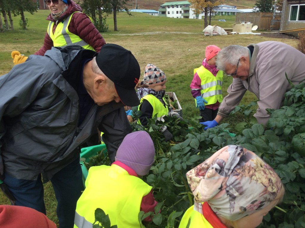 Eitt af verkefnum Grænafánans er að rækta kartöflur. Nú í vor var loksins komið af stað samstarfsverkefni á milli Krílakots og Dalbæ. Nemendur sem eru þá á Kátakoti setja niður útsæði með dyggri aðstoð heimilsfólk á Dalbæ og svo þegar þau eru komin á Hólakot taka þau þær upp og fá að borða í hádeginu. Mjög skemmtilegt og gefandi verkefni fyrir alla.