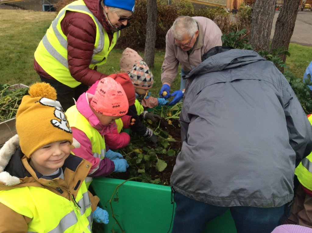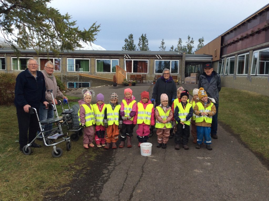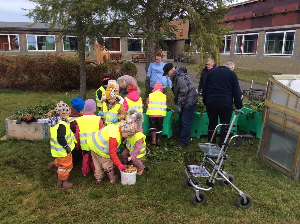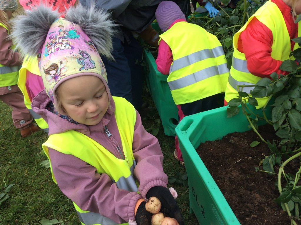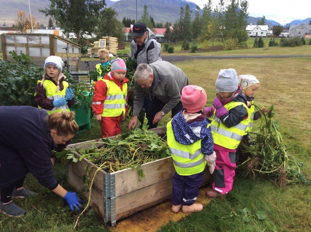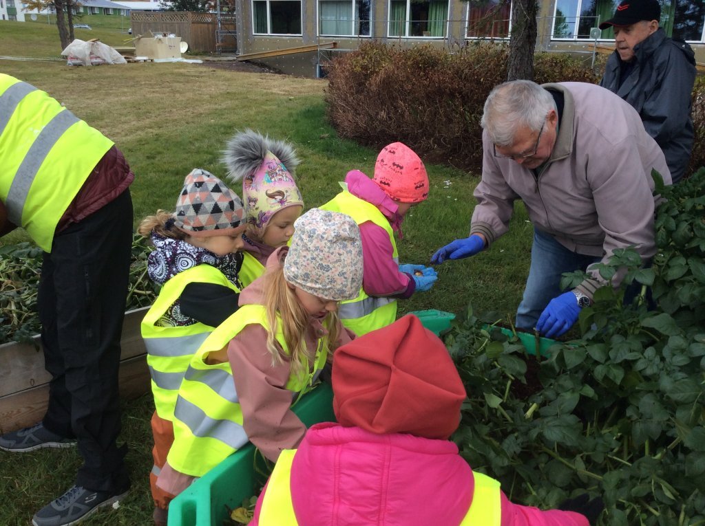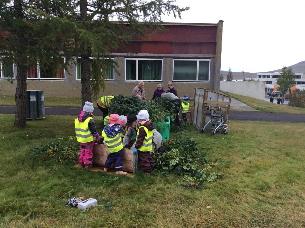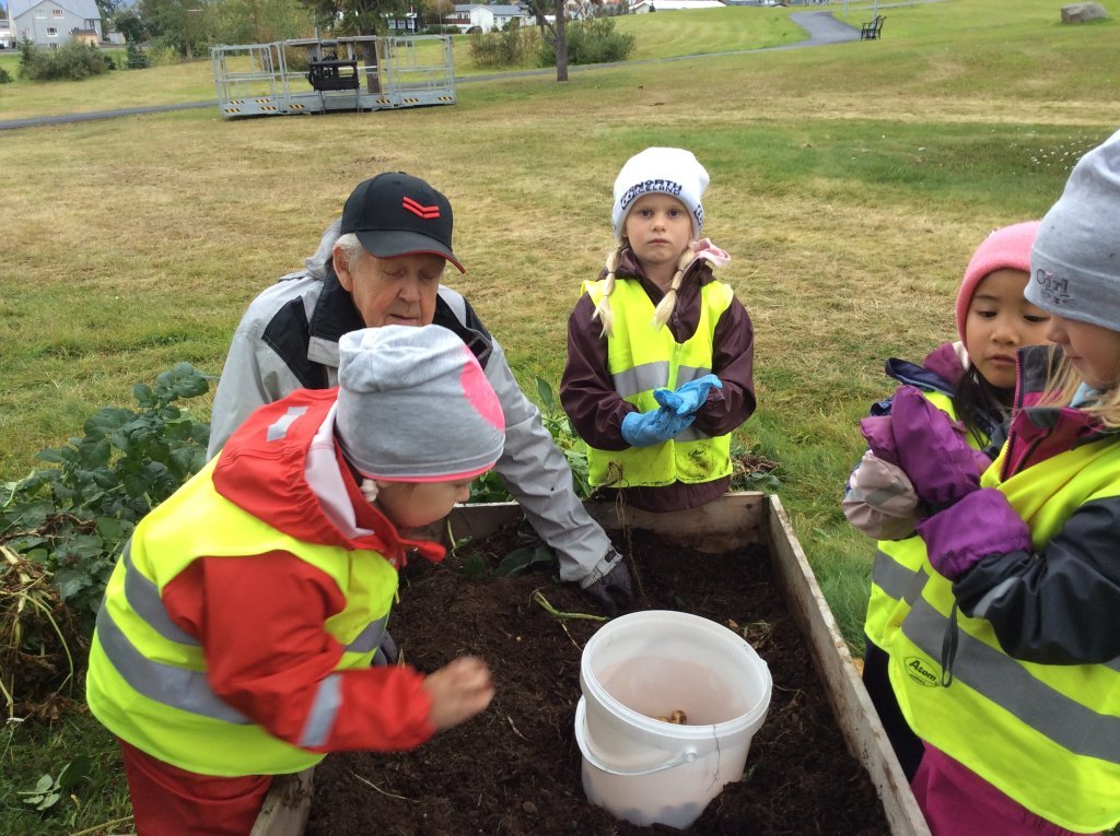 Eitt af verkefnum Grænafánans er að rækta kartöflur. Nú í vor var loksins komið af stað samstarfsverkefni á milli Krílakots og Dalbæ. Nemendur sem eru þá á Kátakoti setja niður útsæði með dyggri aðstoð heimilsfólk á Dalbæ og svo þegar þau eru komin á Hólakot taka þau þær upp og fá að borða í hádeginu. Mjög skemmtilegt og gefandi verkefni fyrir alla.