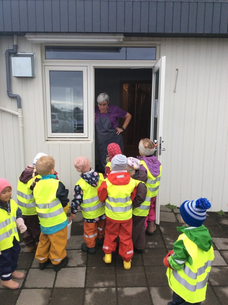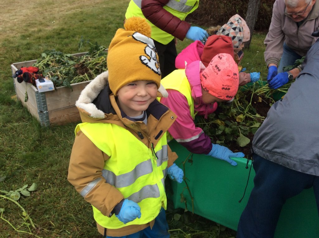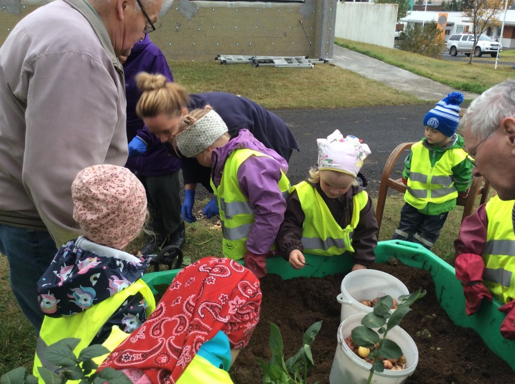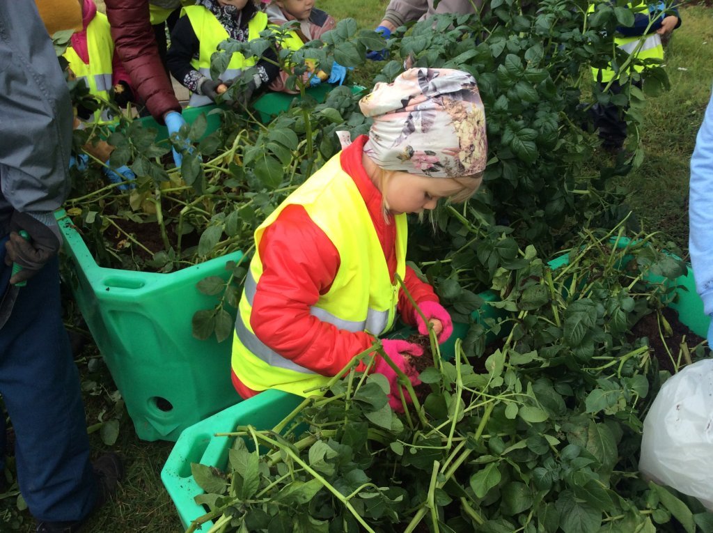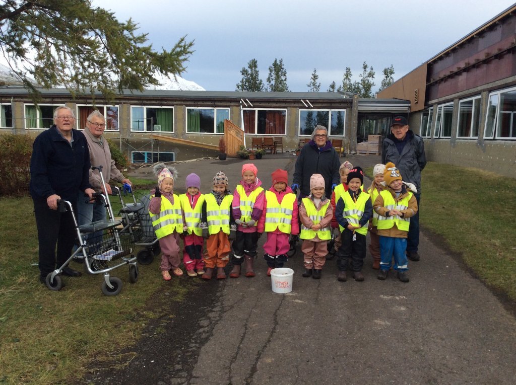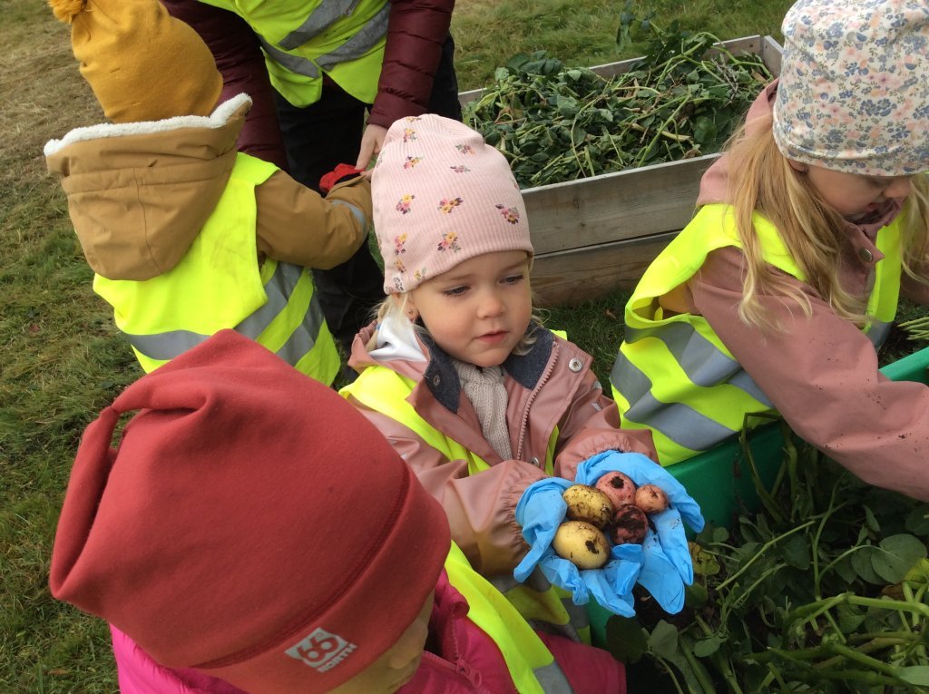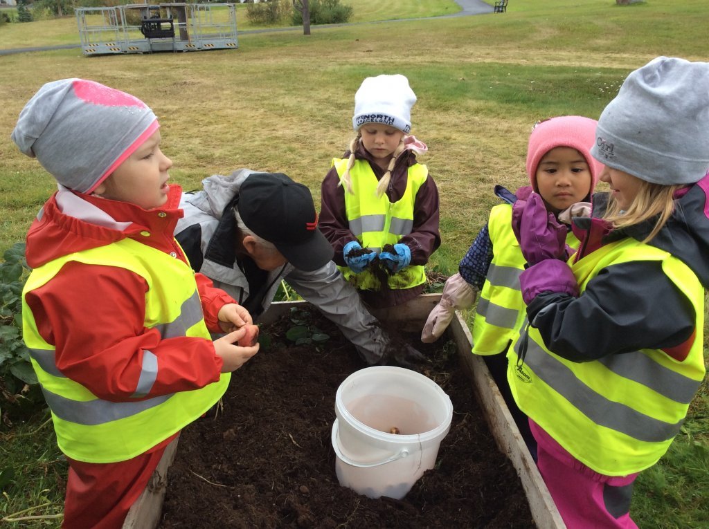 Eitt af verkefnum Grænafánans er að rækta kartöflur. Nú í vor var loksins komið af stað samstarfsverkefni á milli Krílakots og Dalbæ. Nemendur sem eru þá á Kátakoti setja niður útsæði með dyggri aðstoð heimilsfólk á Dalbæ og svo þegar þau eru komin á Hólakot taka þau þær upp og fá að borða í hádeginu. Mjög skemmtilegt og gefandi verkefni fyrir alla.
