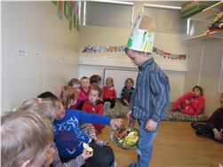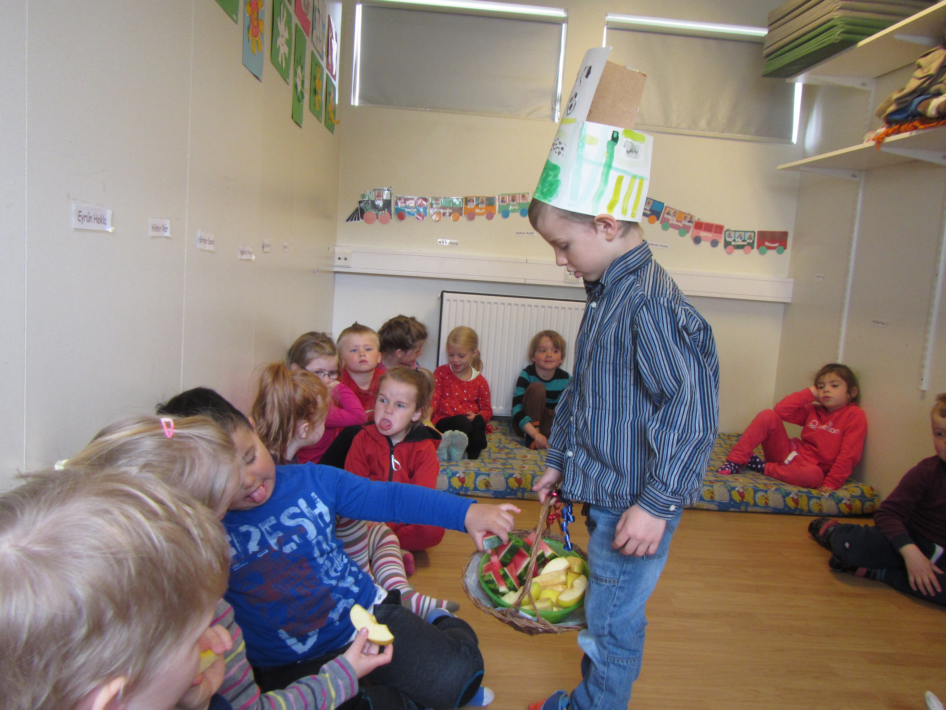 og bauð svo öllum í Mánakoti upp á ávexti úr afmæliskörfunni.