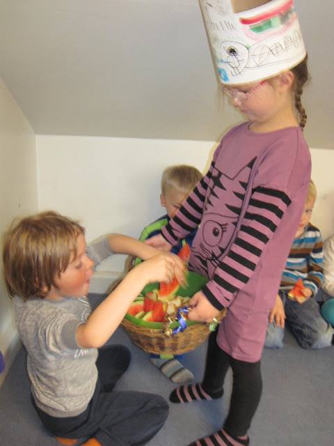 bauð svo öllum í Sólkoti upp á ávexti úr afmæliskörfunni.