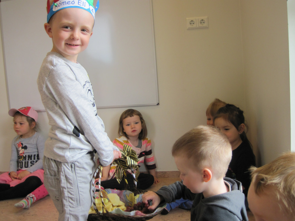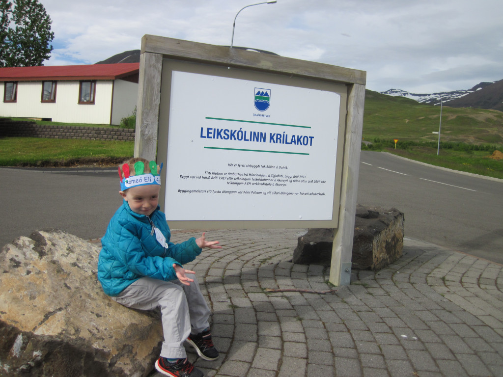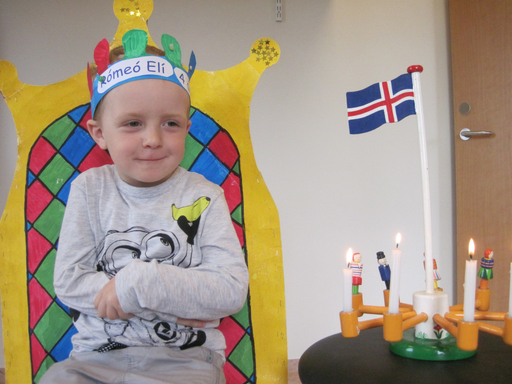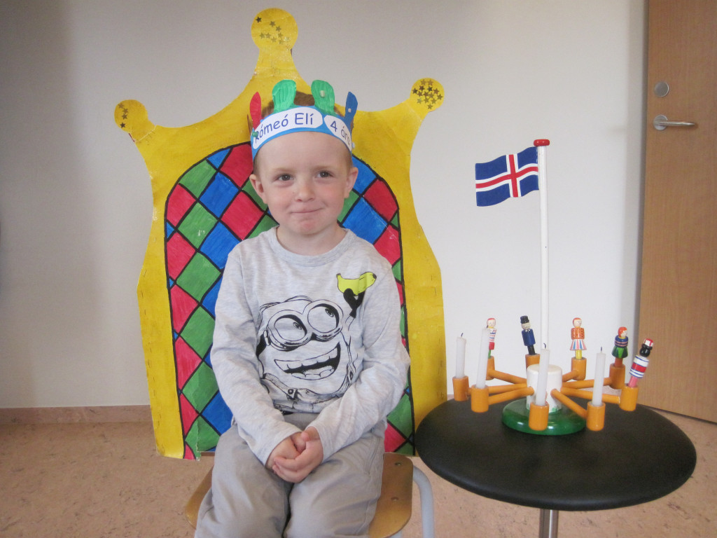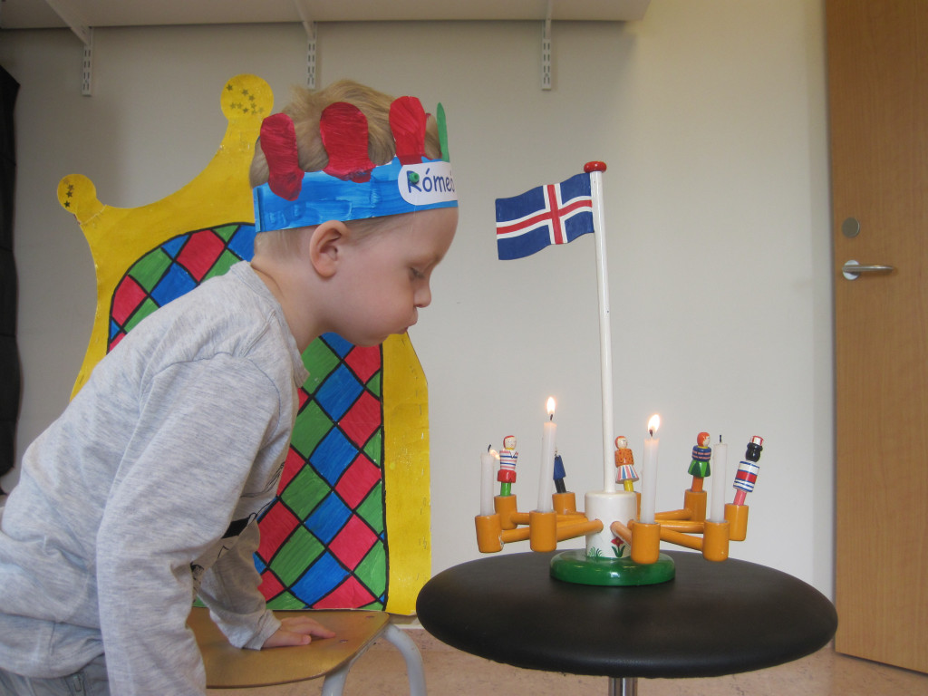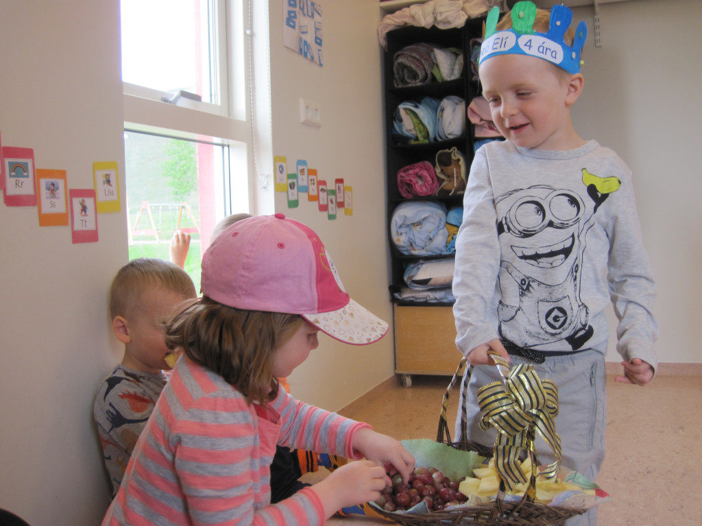 Í gær héldum við upp á 4 ára afmælið hans Rómeó Elís, en hann átti afmæli 18. júní síðastliðinn. Hann bjó sér til fallega kórónu og flaggði íslenska fánanum í tilefni dagsins. Í ávaxtastundinni bauð hann upp á ávexti úr ávaxtakörfunni og við sungum fyrir hann afmælissönginn, hann hefur stækkað í nótt og þetta er afmæliskveðja.