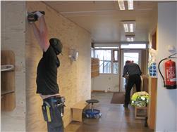 Opnað milli bygginga, eldri forstofan og sú nýja mætast.