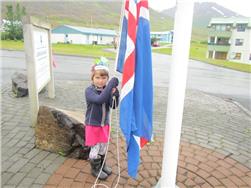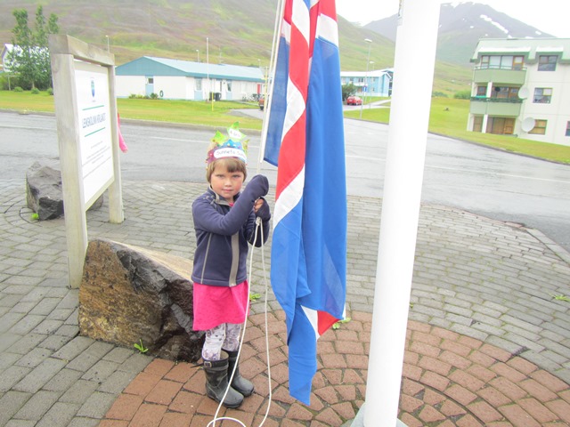Sunnefa Sumarrós bjó sér til glæsilega kórónu, flaggaði íslenska fánanum, sungum fyrir hana afmælissönginn