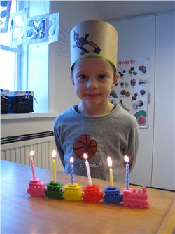 Unnar Marinó bjó sér til þessa fallegu kórónu, blés á kertin 6