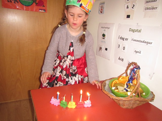 Valgerður Fríður bjó sér til þessa fallegu kórónu, blés á kertin 5