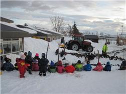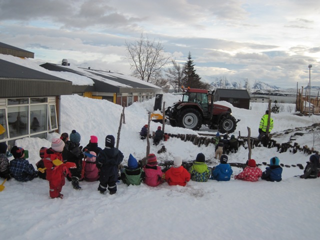 Vetur konungur hefur heimsótt okkur og má segja að Krílakot sé á kafi í snjó þó svo hann hafi aðeins farið niður á við síðasta sólarhringinn. Við höfum reynt að fara með börnin út alla daga en það duttu út einhverjir dagar síðustu tvær vikur vegna veðurs og færðar en við skiptum börnunum í hópa, sum voru inni meðan önnur fóru út. Fyrst gátum við með góðu móti verið á lóðinni og er gaman að segja frá því að ungliðarnir í Björgunarsveit Dalvíkurbyggðar mokuðu frá öllum útgönguleiðum hjá okkur eftir fyrsta stóra hretið en því miður fylltist það jafnharðan og rúmlega það. Lóðin okkar fór svo á kaf, snjórinn linur og sukku börnin í hverju skrefi svo tekið var á það ráð að tæma bílastæðið og leggja fyrir innkeyrsluna og njóta útiveru á bílaplaninu.