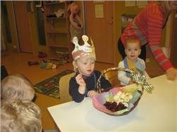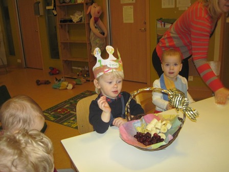 Í ávaxtastundinni sungum við fyrir hann afmælissönginn, hann hefur stækkað í nótt og þetta er afmæliskveðja.