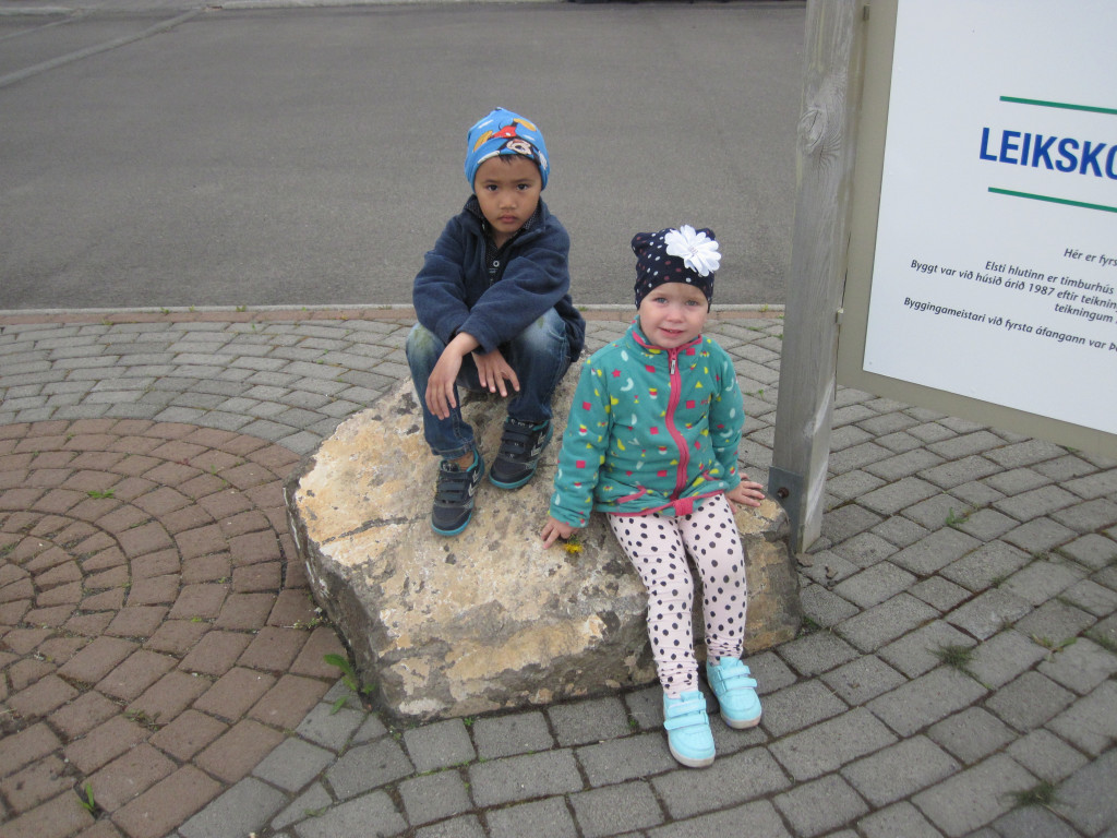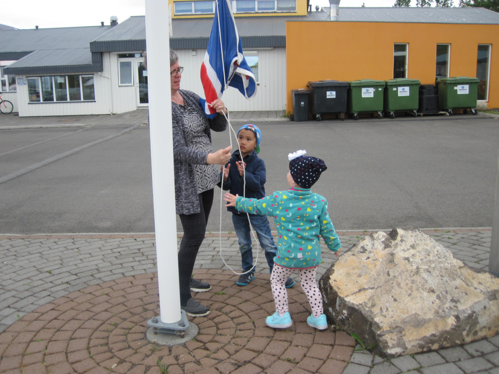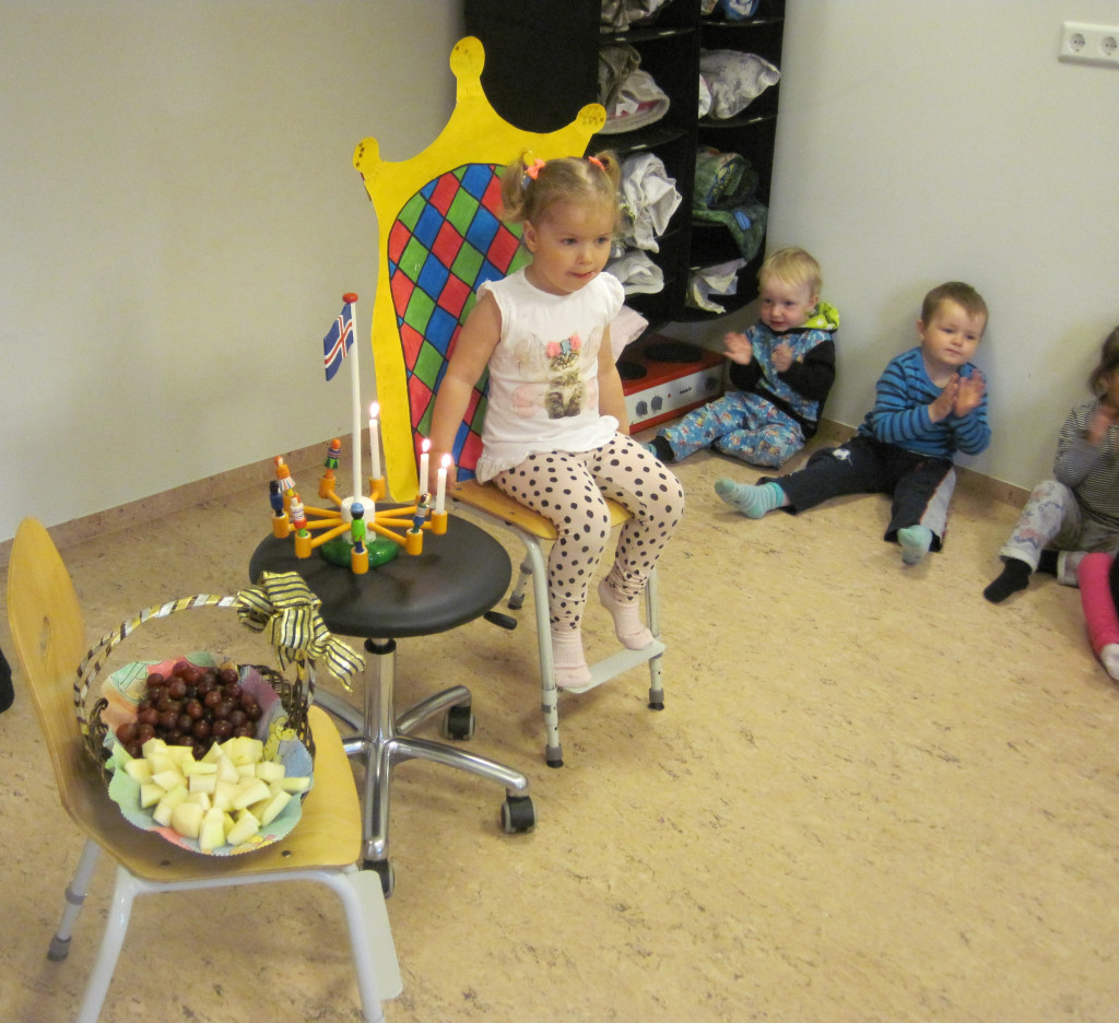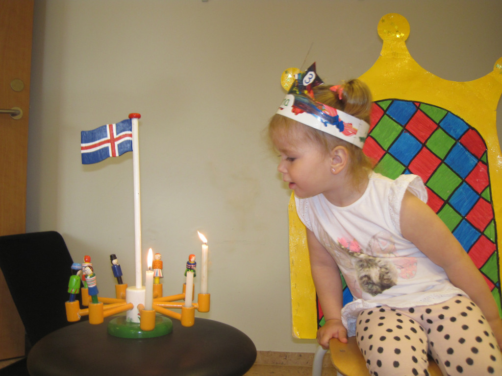 Hún bjó sér til fallega kórónu og flaggði íslenska fánanum í tilefni dagsins. Í ávaxtastundinni bauð hún upp á ávexti úr ávaxtakörfunni og við sungum fyrir hana afmælissönginn, hún hefur stækkað í nótt og þetta er afmæliskveðja.