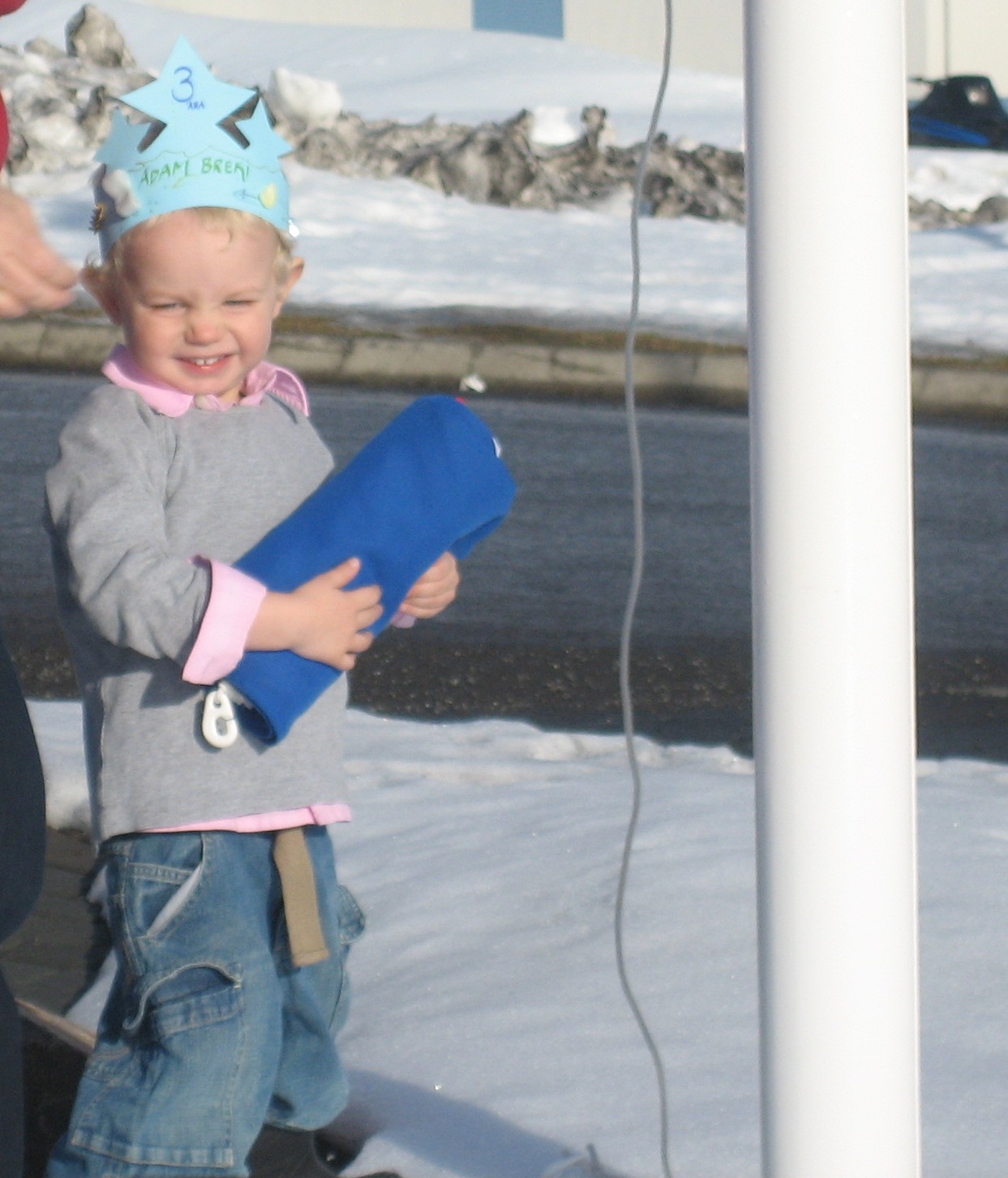 Í morgun héldum við upp á afmælið hans Adams Breka sem verður 3. ára þann 13. apríl. Adam Breki byrjaði daginn á því að fá kórónuna sína og fór út og flaggaði. Síðan sungu allir fyrir hann í tilefni dagsins og hann blés á kertin sín þrjú. Eftir sönginn bauð hann öllum upp á ávexti úr afmæliskörfunni. Einnig var hann þjónn dagsins.Við óskum honum innilega til hamingju með daginn.