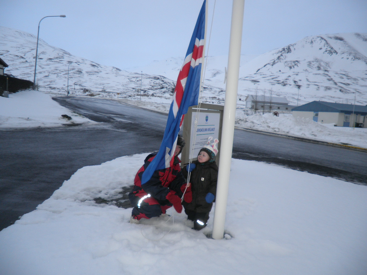 Alexander Dagur bjó sér til kórónu, fór út að flagga íslenska fánanum,