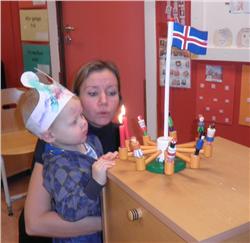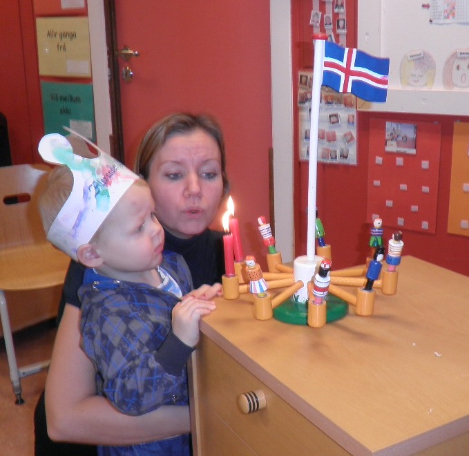 og var haldið upp á afmælið hans hér í leikskólanum í dag.
