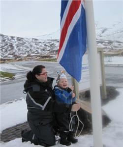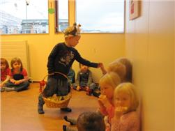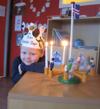Alexander Dagur málaði sér kórónu og flaggaði íslenska fánanum. Í ávaxtastundinni sungum við fyrir hann afmælissönginn og hann blés á kertin þrjú.