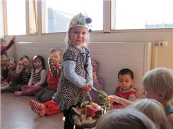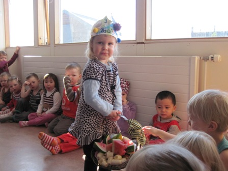Eftir sönginn bauð Ásdís Inga öllum á Skakkalandi upp á ávexti úr ávaxtakörfunni.