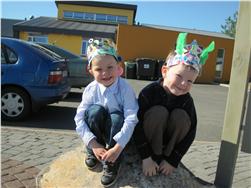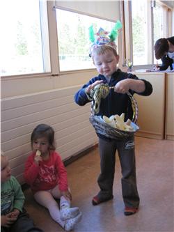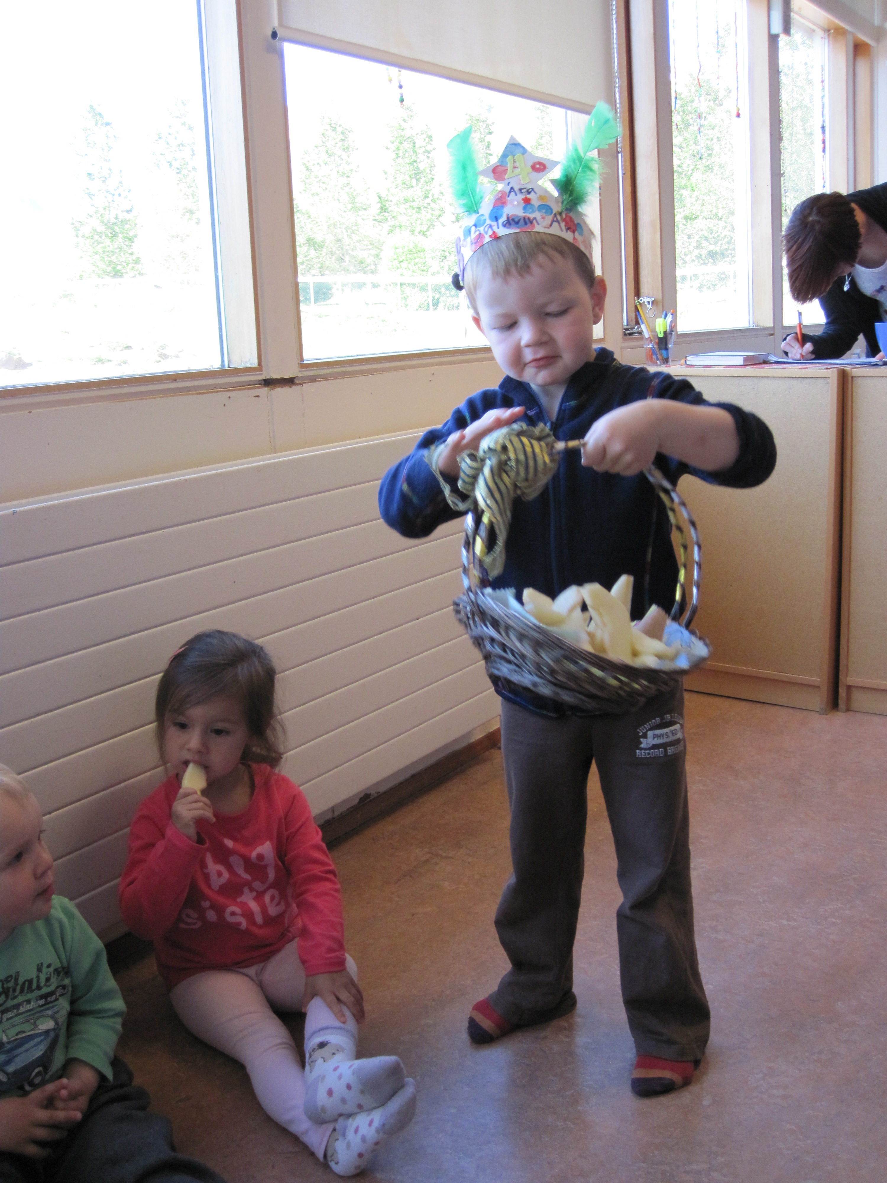 Eftir sönginn bauð Baldvin Ari öllum á Skakkalandi upp á ávexti úr ávaxtakörfunni.
