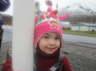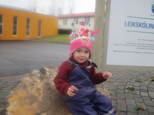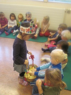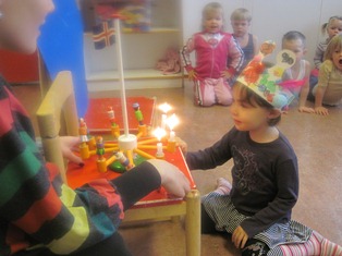 Bryndís Lalíta málaði sér kórónu og skreytti hana. Í ávaxtastundinni sungum við fyrir hana afmælissönginn og hún blés á kertin þrjú. Eftir sönginn bauð hún öllum á Skakkalandi upp á ávexti úr afmælisávaxtakörfunni.