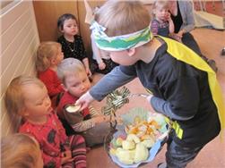 Eftir sönginn fengu sér allir ávexti úr ávaxtakörfunni.