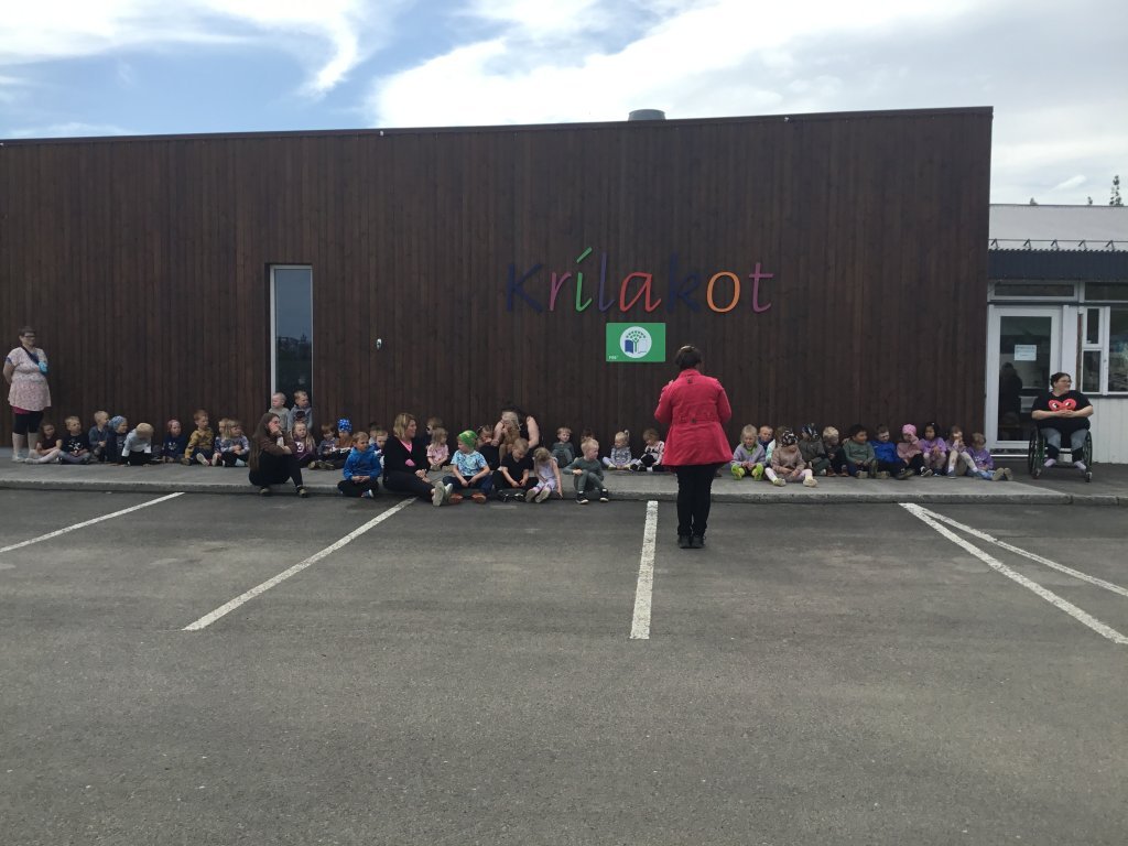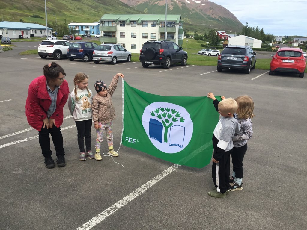 Í dag var nýjum grænfána flaggað á Krílakoti í sjötta sinn. Guðrún frá Landvernd kom og talaði um mikilvægi þess að ganga vel um jörðina og halda áfram þeim flottu verkefnum sem unnin hafa verið í Krílakoti. Síðan afhenti hún grænfánanefnd skólans fánann.