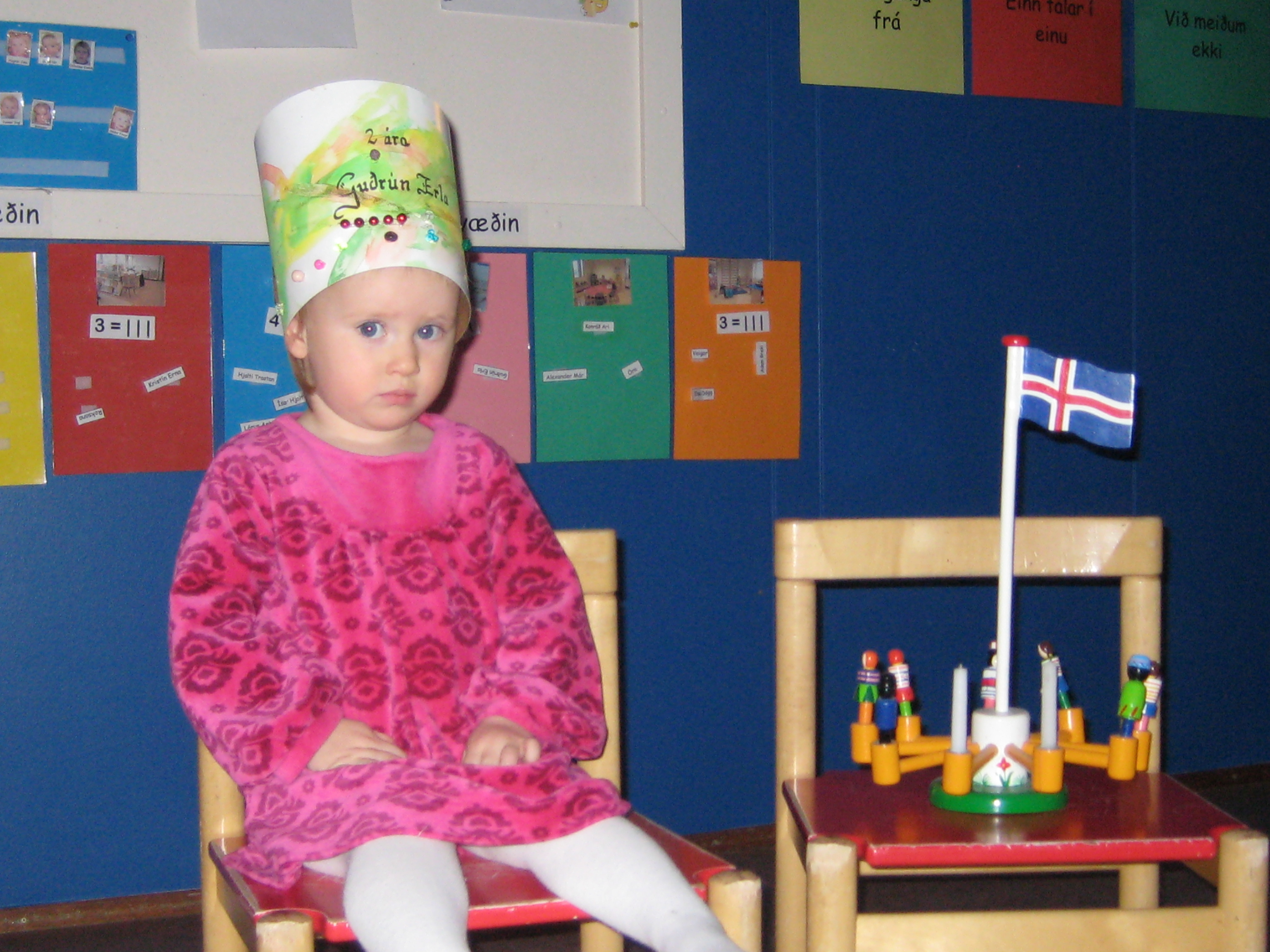 Í morgun 25. nóvember héldum við upp á 2. ára afmælið hennar Guðrúnar Erlu. Hún byrjaði daginn á því að búa sér til kórónu, bauð öllum upp á ávexti og svo sungu allir afmælissönginn í tilefni dagsins. Einnig fór hún út og flaggaði og var þjónn dagsins. Við óskum henni innilega til hamingju með daginn. Kveðja frá börnum og starfsfólki á Krílakoti.