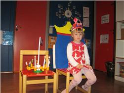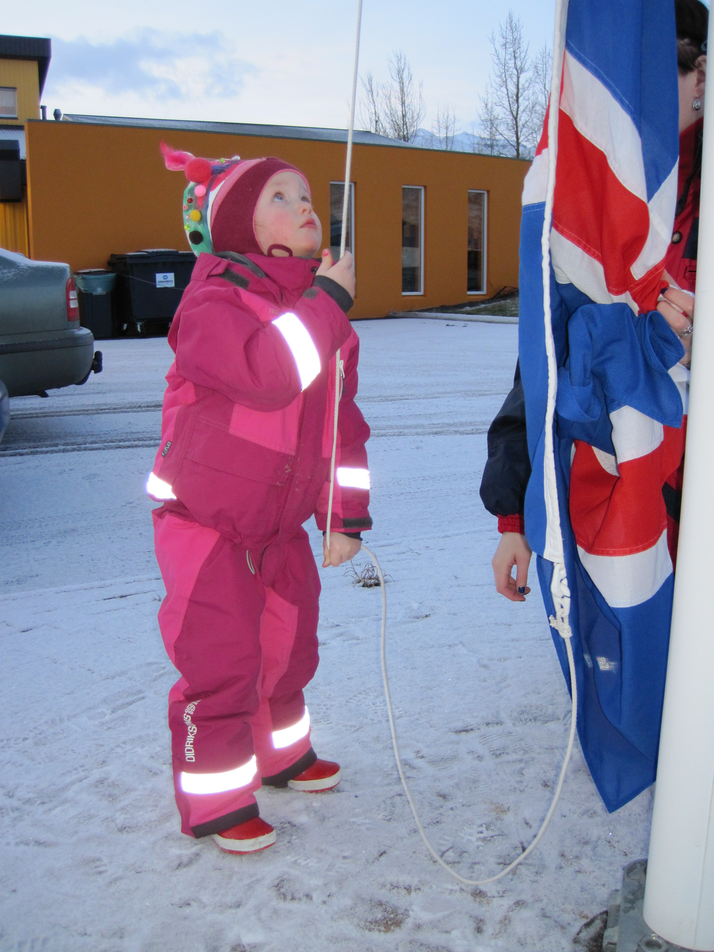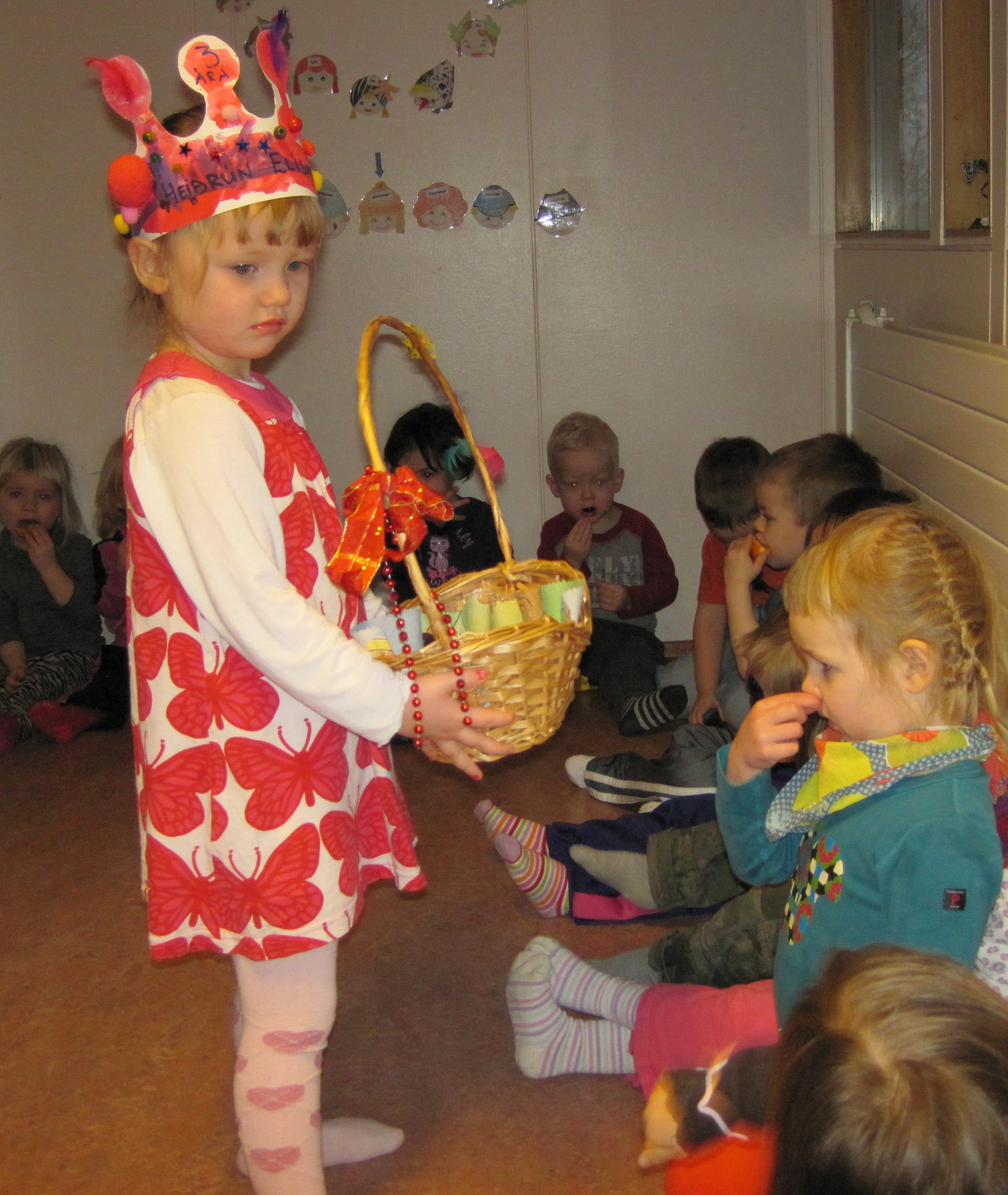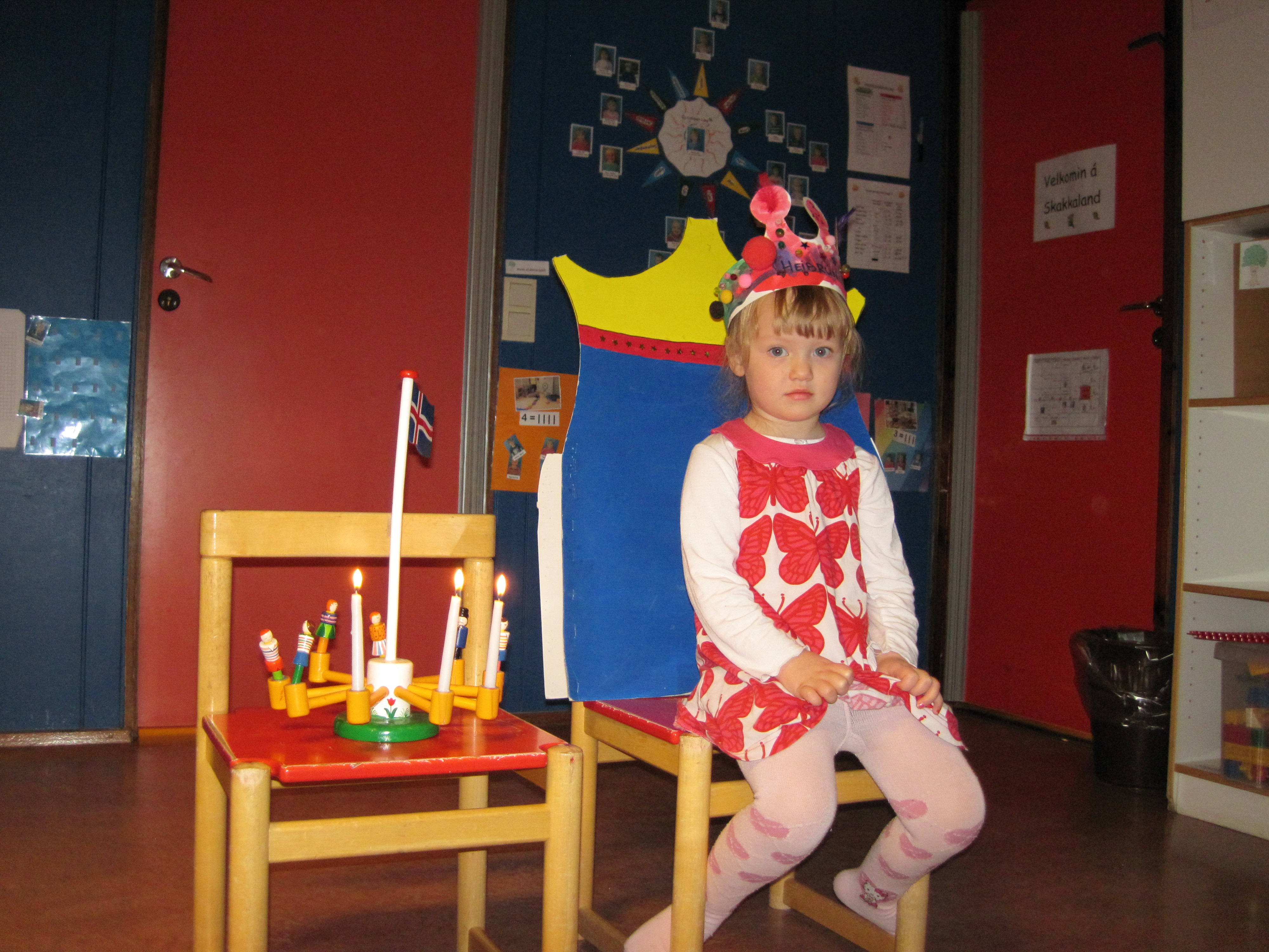 Heiðrún Elísa málaði sér kórónu og flaggaði íslenska fánanum. Í ávaxtastundinni sungum við fyrir hana afmælissönginn og hún blés á kertin þrjú.