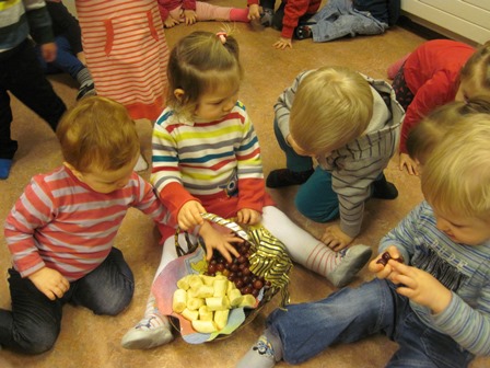 Eftir sönginn fengu allir sér ávexti úr ávaxtakörfunni.
