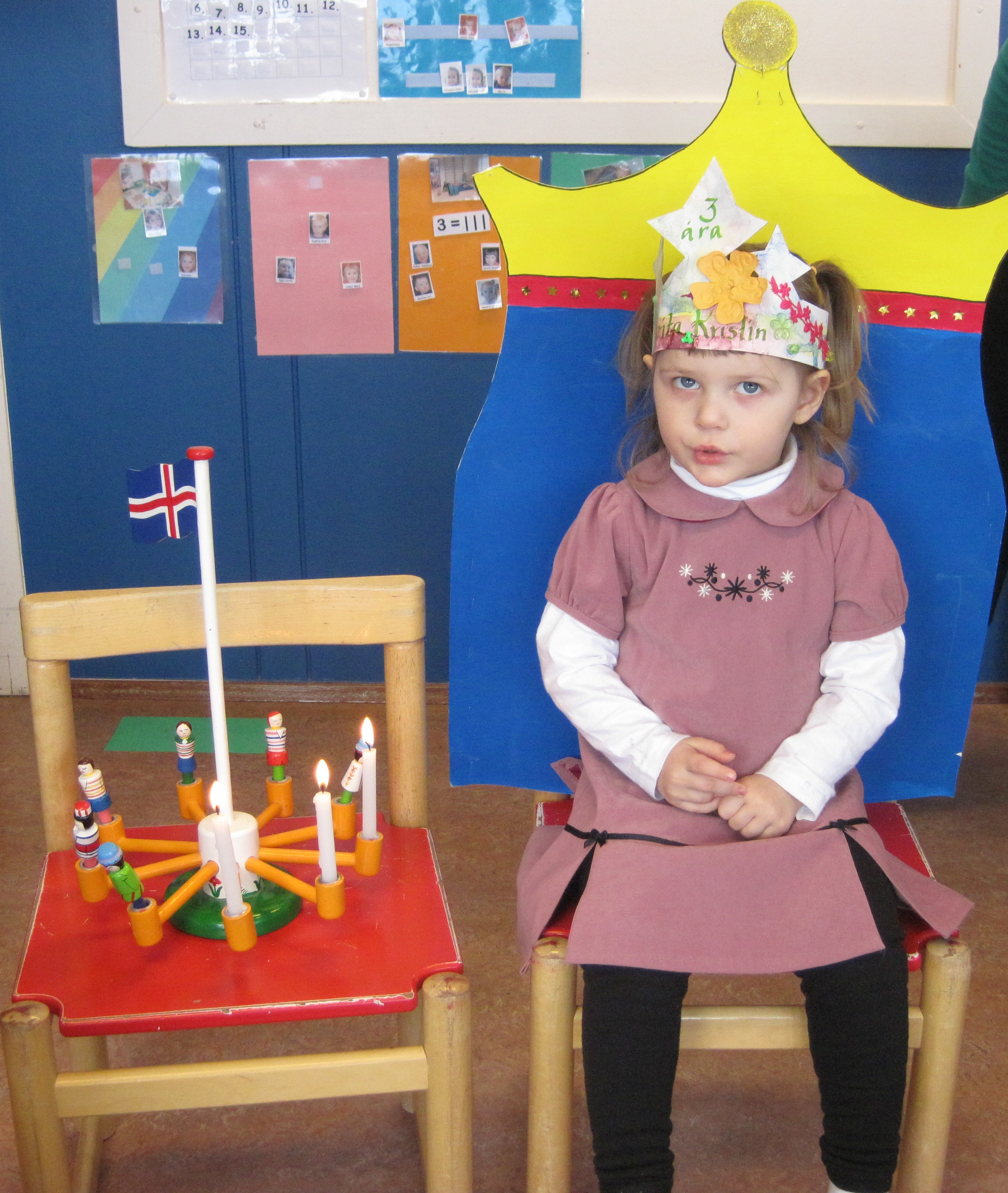 Í gær 21. mars varð Karita Kristín 3. ára. Hún bjó sér til kórónu og fór út og flaggaði íslenska fánanum. Í ávaxtastundinni sungum við fyrir hana afmælissönginn og hún blés á kertin þrjú. Eftir sönginn bauð Karita Kristín öllum á Skakaklandi upp á ávexti úr afmæliskörfunni.. Við óskum Karitu Kristínu og fjölskyldu innilega til hamingju með daginn frá okkur öllum á Skakkalandi.